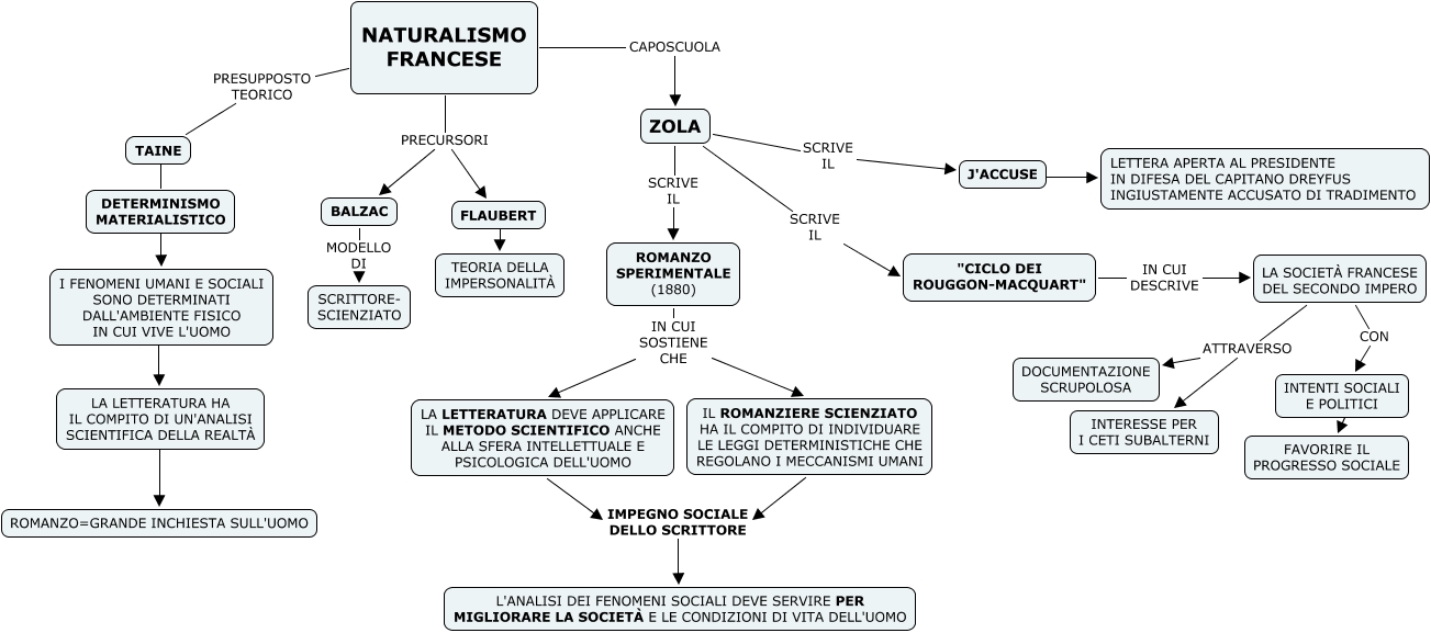 Questa Cmap, creata con IHMC CmapTools, contiene informazioni relative a: NATURALISMO, ZOLA SCRIVE IL "CICLO DEI ROUGGON-MACQUART", ZOLA SCRIVE IL ROMANZO SPERIMENTALE (1880), ZOLA SCRIVE IL J'ACCUSE, J'ACCUSE ???? LETTERA APERTA AL PRESIDENTE IN DIFESA DEL CAPITANO DREYFUS INGIUSTAMENTE ACCUSATO DI TRADIMENTO, "CICLO DEI ROUGGON-MACQUART" IN CUI DESCRIVE LA SOCIETÀ FRANCESE DEL SECONDO IMPERO, ROMANZO SPERIMENTALE (1880) IN CUI SOSTIENE CHE LA LETTERATURA DEVE APPLICARE IL METODO SCIENTIFICO ANCHE ALLA SFERA INTELLETTUALE E PSICOLOGICA DELL'UOMO, I FENOMENI UMANI E SOCIALI SONO DETERMINATI DALL'AMBIENTE FISICO IN CUI VIVE L'UOMO ???? LA LETTERATURA HA IL COMPITO DI UN'ANALISI SCIENTIFICA DELLA REALTÀ, NATURALISMO FRANCESE CAPOSCUOLA ZOLA, INTENTI SOCIALI E POLITICI ???? FAVORIRE IL PROGRESSO SOCIALE, DETERMINISMO MATERIALISTICO ???? I FENOMENI UMANI E SOCIALI SONO DETERMINATI DALL'AMBIENTE FISICO IN CUI VIVE L'UOMO, NATURALISMO FRANCESE PRESUPPOSTO TEORICO TAINE, NATURALISMO FRANCESE PRECURSORI BALZAC, LA SOCIETÀ FRANCESE DEL SECONDO IMPERO ATTRAVERSO INTERESSE PER I CETI SUBALTERNI, LA LETTERATURA DEVE APPLICARE IL METODO SCIENTIFICO ANCHE ALLA SFERA INTELLETTUALE E PSICOLOGICA DELL'UOMO IMPEGNO SOCIALE DELLO SCRITTORE L'ANALISI DEI FENOMENI SOCIALI DEVE SERVIRE PER MIGLIORARE LA SOCIETÀ E LE CONDIZIONI DI VITA DELL'UOMO, LA LETTERATURA HA IL COMPITO DI UN'ANALISI SCIENTIFICA DELLA REALTÀ ???? ROMANZO=GRANDE INCHIESTA SULL'UOMO, FLAUBERT ???? TEORIA DELLA IMPERSONALITÀ, TAINE ???? DETERMINISMO MATERIALISTICO, LA SOCIETÀ FRANCESE DEL SECONDO IMPERO ATTRAVERSO DOCUMENTAZIONE SCRUPOLOSA, NATURALISMO FRANCESE PRECURSORI FLAUBERT, BALZAC MODELLO DI SCRITTORE- SCIENZIATO