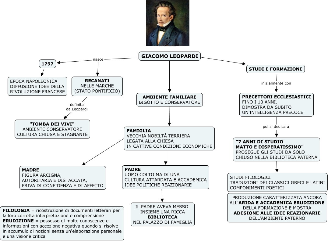 Questa Cmap, creata con IHMC CmapTools, contiene informazioni relative a: leopardi - la vita 1, FAMIGLIA VECCHIA NOBILTÀ TERRIERA LEGATA ALLA CHIESA IN CATTIVE CONDIZIONI ECONOMICHE ???? PADRE UOMO COLTO MA DI UNA CULTURA ATTARDATA E ACCADEMICA IDEE POLITICHE REAZIONARIE, GIACOMO LEOPARDI nasce 1797, GIACOMO LEOPARDI nasce RECANATI NELLE MARCHE (STATO PONTIFICIO), GIACOMO LEOPARDI ???? AMBIENTE FAMILIARE BIGOTTO E CONSERVATORE, RECANATI NELLE MARCHE (STATO PONTIFICIO) definita da Leopardi "TOMBA DEI VIVI" AMBIENTE CONSERVATORE CULTURA CHIUSA E STAGNANTE, PADRE UOMO COLTO MA DI UNA CULTURA ATTARDATA E ACCADEMICA IDEE POLITICHE REAZIONARIE ???? IL PADRE AVEVA MESSO INSIEME UNA RICCA BIBLIOTECA NEL PALAZZO DI FAMIGLIA, STUDI E FORMAZIONE inizialmente con PRECETTORI ECCLESIASTICI FINO I 10 ANNI. DIMOSTRA DA SUBITO UN'INTELLIGENZA PRECOCE, GIACOMO LEOPARDI ???? STUDI E FORMAZIONE, FAMIGLIA VECCHIA NOBILTÀ TERRIERA LEGATA ALLA CHIESA IN CATTIVE CONDIZIONI ECONOMICHE ???? MADRE FIGURA ARCIGNA, AUTORITARIA E DISTACCATA, PRIVA DI CONFIDENZA E DI AFFETTO, AMBIENTE FAMILIARE BIGOTTO E CONSERVATORE ???? FAMIGLIA VECCHIA NOBILTÀ TERRIERA LEGATA ALLA CHIESA IN CATTIVE CONDIZIONI ECONOMICHE, PRECETTORI ECCLESIASTICI FINO I 10 ANNI. DIMOSTRA DA SUBITO UN'INTELLIGENZA PRECOCE poi si dedica a "7 ANNI DI STUDIO MATTO E DISPERATISSIMO" PROSEGUE GLI STUDI DA SOLO CHIUSO NELLA BIBLIOTECA PATERNA, "7 ANNI DI STUDIO MATTO E DISPERATISSIMO" PROSEGUE GLI STUDI DA SOLO CHIUSO NELLA BIBLIOTECA PATERNA ???? STUDI FILOLOGICI TRADUZIONI DEI CLASSICI GRECI E LATINI COMPONIMENTI POETICI, 1797 ???? EPOCA NAPOLEONICA DIFFUSIONE IDEE DELLA RIVOLUZIONE FRANCESE