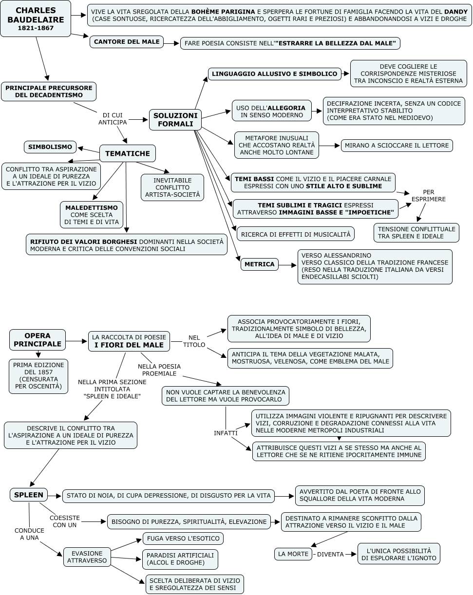 Questa Cmap, creata con IHMC CmapTools, contiene informazioni relative a: BAUDELAIRE, LA RACCOLTA DI POESIE I FIORI DEL MALE NEL TITOLO ASSOCIA PROVOCATORIAMENTE I FIORI, TRADIZIONALMENTE SIMBOLO DI BELLEZZA, ALL'IDEA DI MALE E DI VIZIO, LA MORTE DIVENTA L'UNICA POSSIBILITÀ DI ESPLORARE L'IGNOTO, LA RACCOLTA DI POESIE I FIORI DEL MALE NELLA PRIMA SEZIONE INTITOLATA "SPLEEN E IDEALE" DESCRIVE IL CONFLITTO TRA L'ASPIRAZIONE A UN IDEALE DI PUREZZA E L'ATTRAZIONE PER IL VIZIO, METRICA ???? VERSO ALESSANDRINO VERSO CLASSICO DELLA TRADIZIONE FRANCESE (RESO NELLA TRADUZIONE ITALIANA DA VERSI ENDECASILLABI SCIOLTI), CHARLES BAUDELAIRE 1821-1867 ???? VIVE LA VITA SREGOLATA DELLA BOHÈME PARIGINA E SPERPERA LE FORTUNE DI FAMIGLIA FACENDO LA VITA DEL DANDY (CASE SONTUOSE, RICERCATEZZA DELL'ABBIGLIAMENTO, OGETTI RARI E PREZIOSI) E ABBANDONANDOSI A VIZI E DROGHE, EVASIONE ATTRAVERSO ???? PARADISI ARTIFICIALI (ALCOL E DROGHE), STATO DI NOIA, DI CUPA DEPRESSIONE, DI DISGUSTO PER LA VITA ???? AVVERTITO DAL POETA DI FRONTE ALLO SQUALLORE DELLA VITA MODERNA, CANTORE DEL MALE ???? FARE POESIA CONSISTE NELL'"ESTRARRE LA BELLEZZA DAL MALE", EVASIONE ATTRAVERSO ???? SCELTA DELIBERATA DI VIZIO E SREGOLATEZZA DEI SENSI, TEMATICHE ???? MALEDETTISMO COME SCELTA DI TEMI E DI VITA, PRINCIPALE PRECURSORE DEL DECADENTISMO DI CUI ANTICIPA TEMATICHE, CHARLES BAUDELAIRE 1821-1867 ???? CANTORE DEL MALE, METAFORE INUSUALI CHE ACCOSTANO REALTÀ ANCHE MOLTO LONTANE ???? MIRANO A SCIOCCARE IL LETTORE, USO DELL'ALLEGORIA IN SENSO MODERNO ???? DECIFRAZIONE INCERTA, SENZA UN CODICE INTERPRETATIVO STABILITO (COME ERA STATO NEL MEDIOEVO), SOLUZIONI FORMALI ???? RICERCA DI EFFETTI DI MUSICALITÀ, TEMATICHE ???? RIFIUTO DEI VALORI BORGHESI DOMINANTI NELLA SOCIETÀ MODERNA E CRITICA DELLE CONVENZIONI SOCIALI, SPLEEN COESISTE CON UN BISOGNO DI PUREZZA, SPIRITUALITÀ, ELEVAZIONE, OPERA PRINCIPALE ???? PRIMA EDIZIONE DEL 1857 (CENSURATA PER OSCENITÀ), UTILIZZA IMMAGINI VIOLENTE E RIPUGNANTI PER DESCRIVERE VIZI, CORRUZIONE E DEGRADAZIONE CONNESSI ALLA VITA NELLE MODERNE METROPOLI INDUSTRIALI ???? ATTRIBUISCE QUESTI VIZI A SE STESSO MA ANCHE AL LETTORE CHE SE NE RITIENE IPOCRITAMENTE IMMUNE, TEMI SUBLIMI E TRAGICI ESPRESSI ATTRAVERSO IMMAGINI BASSE E "IMPOETICHE" PER ESPRIMERE TENSIONE CONFLITTUALE TRA SPLEEN E IDEALE