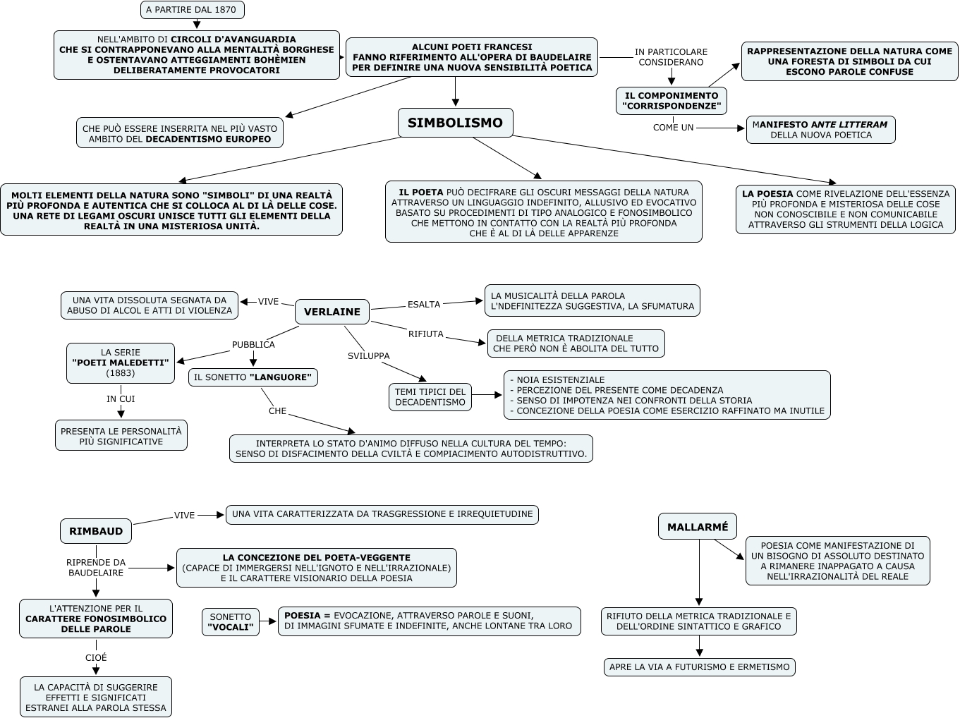 Questa Cmap, creata con IHMC CmapTools, contiene informazioni relative a: SIMBOLISMO, RIFIUTO DELLA METRICA TRADIZIONALE E DELL'ORDINE SINTATTICO E GRAFICO ???? APRE LA VIA A FUTURISMO E ERMETISMO, SIMBOLISMO ???? MOLTI ELEMENTI DELLA NATURA SONO "SIMBOLI" DI UNA REALTÀ PIÙ PROFONDA E AUTENTICA CHE SI COLLOCA AL DI LÀ DELLE COSE. UNA RETE DI LEGAMI OSCURI UNISCE TUTTI GLI ELEMENTI DELLA REALTÀ IN UNA MISTERIOSA UNITÀ., ALCUNI POETI FRANCESI FANNO RIFERIMENTO ALL'OPERA DI BAUDELAIRE PER DEFINIRE UNA NUOVA SENSIBILITÀ POETICA ???? CHE PUÒ ESSERE INSERRITA NEL PIÙ VASTO AMBITO DEL DECADENTISMO EUROPEO, RIMBAUD VIVE UNA VITA CARATTERIZZATA DA TRASGRESSIONE E IRREQUIETUDINE, RIMBAUD RIPRENDE DA BAUDELAIRE L'ATTENZIONE PER IL CARATTERE FONOSIMBOLICO DELLE PAROLE, SONETTO "VOCALI" ???? POESIA = EVOCAZIONE, ATTRAVERSO PAROLE E SUONI, DI IMMAGINI SFUMATE E INDEFINITE, ANCHE LONTANE TRA LORO, LA SERIE "POETI MALEDETTI" (1883) IN CUI PRESENTA LE PERSONALITÀ PIÙ SIGNIFICATIVE, VERLAINE PUBBLICA LA SERIE "POETI MALEDETTI" (1883), L'ATTENZIONE PER IL CARATTERE FONOSIMBOLICO DELLE PAROLE CIOÉ LA CAPACITÀ DI SUGGERIRE EFFETTI E SIGNIFICATI ESTRANEI ALLA PAROLA STESSA, MALLARMÉ ???? RIFIUTO DELLA METRICA TRADIZIONALE E DELL'ORDINE SINTATTICO E GRAFICO, A PARTIRE DAL 1870 ???? NELL'AMBITO DI CIRCOLI D'AVANGUARDIA CHE SI CONTRAPPONEVANO ALLA MENTALITÀ BORGHESE E OSTENTAVANO ATTEGGIAMENTI BOHÈMIEN DELIBERATAMENTE PROVOCATORI, IL COMPONIMENTO "CORRISPONDENZE" ???? RAPPRESENTAZIONE DELLA NATURA COME UNA FORESTA DI SIMBOLI DA CUI ESCONO PAROLE CONFUSE, NELL'AMBITO DI CIRCOLI D'AVANGUARDIA CHE SI CONTRAPPONEVANO ALLA MENTALITÀ BORGHESE E OSTENTAVANO ATTEGGIAMENTI BOHÈMIEN DELIBERATAMENTE PROVOCATORI ???? ALCUNI POETI FRANCESI FANNO RIFERIMENTO ALL'OPERA DI BAUDELAIRE PER DEFINIRE UNA NUOVA SENSIBILITÀ POETICA, VERLAINE SVILUPPA TEMI TIPICI DEL DECADENTISMO, RIMBAUD RIPRENDE DA BAUDELAIRE LA CONCEZIONE DEL POETA-VEGGENTE (CAPACE DI IMMERGERSI NELL'IGNOTO E NELL'IRRAZIONALE) E IL CARATTERE VISIONARIO DELLA POESIA, TEMI TIPICI DEL DECADENTISMO ???? - NOIA ESISTENZIALE - PERCEZIONE DEL PRESENTE COME DECADENZA - SENSO DI IMPOTENZA NEI CONFRONTI DELLA STORIA - CONCEZIONE DELLA POESIA COME ESERCIZIO RAFFINATO MA INUTILE, MALLARMÉ ???? POESIA COME MANIFESTAZIONE DI UN BISOGNO DI ASSOLUTO DESTINATO A RIMANERE INAPPAGATO A CAUSA NELL'IRRAZIONALITÀ DEL REALE, VERLAINE PUBBLICA IL SONETTO "LANGUORE", VERLAINE VIVE UNA VITA DISSOLUTA SEGNATA DA ABUSO DI ALCOL E ATTI DI VIOLENZA, ALCUNI POETI FRANCESI FANNO RIFERIMENTO ALL'OPERA DI BAUDELAIRE PER DEFINIRE UNA NUOVA SENSIBILITÀ POETICA IN PARTICOLARE CONSIDERANO IL COMPONIMENTO "CORRISPONDENZE"