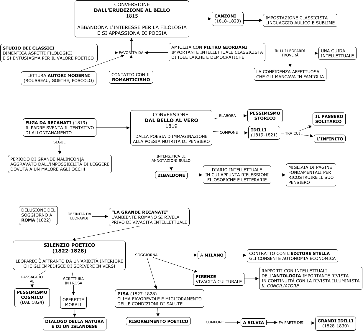 Questa Cmap, creata con IHMC CmapTools, contiene informazioni relative a: leopardi - la vita 2, DIARIO INTELLETTUALE IN CUI APPUNTA RIFLESSIONI FILOSOFICHE E LETTERARIE ???? MIGLIAIA DI PAGINE FONDAMENTALI PER RICOSTRUIRE IL SUO PENSIERO, FUGA DA RECANATI (1819) IL PADRE SVENTA IL TENTATIVO DI ALLONTANAMENTO ???? CONVERSIONE DAL BELLO AL VERO 1819 DALLA POESIA D'IMMAGINAZIONE ALLA POESIA NUTRITA DI PENSIERO, CONVERSIONE DALL'ERUDIZIONE AL BELLO 1815 ABBANDONA L'INTERESSE PER LA FILOLOGIA E SI APPASSIONA DI POESIA ???? CANZONI (1818-1823), DELUSIONE DEL SOGGIORNO A ROMA (1822) DEFINITA DA LEOPARDI "LA GRANDE RECANATI" L'AMBIENTE ROMANO SI RIVELA PRIVO DI VIVACITÀ INTELLETTUALE, SILENZIO POETICO (1822-1828) LEOPARDI È AFFRANTO DA UN'ARIDITÀ INTERIORE CHE GLI IMPEDISCE DI SCRIVERE IN VERSI SOGGIORNA A MILANO, CONTATTO CON IL ROMANTICISMO FAVORITA DA CONVERSIONE DALL'ERUDIZIONE AL BELLO 1815 ABBANDONA L'INTERESSE PER LA FILOLOGIA E SI APPASSIONA DI POESIA, STUDIO DEI CLASSICI DIMENTICA ASPETTI FILOLOGICI E SI ENTUSIASMA PER IL VALORE POETICO FAVORITA DA CONVERSIONE DALL'ERUDIZIONE AL BELLO 1815 ABBANDONA L'INTERESSE PER LA FILOLOGIA E SI APPASSIONA DI POESIA, SILENZIO POETICO (1822-1828) LEOPARDI È AFFRANTO DA UN'ARIDITÀ INTERIORE CHE GLI IMPEDISCE DI SCRIVERE IN VERSI PASSAGGIO AL PESSIMISMO COSMICO (DAL 1824), SILENZIO POETICO (1822-1828) LEOPARDI È AFFRANTO DA UN'ARIDITÀ INTERIORE CHE GLI IMPEDISCE DI SCRIVERE IN VERSI SOGGIORNA PISA (1827-1828) CLIMA FAVOREVOLE E MIGLIORAMENTO DELLE CONDIZIONI DI SALUTE, CONVERSIONE DAL BELLO AL VERO 1819 DALLA POESIA D'IMMAGINAZIONE ALLA POESIA NUTRITA DI PENSIERO COMPONE IDILLI (1819-1821), AMICIZIA CON PIETRO GIORDANI IMPORTANTE INTELLETTUALE CLASSICISTA DI IDEE LAICHE E DEMOCRATICHE IN LUI LEOPARDI TROVERÀ UNA GUIDA INTELLETTUALE, PISA (1827-1828) CLIMA FAVOREVOLE E MIGLIORAMENTO DELLE CONDIZIONI DI SALUTE ???? RISORGIMENTO POETICO, IDILLI (1819-1821) TRA CUI L'INFINITO, SILENZIO POETICO (1822-1828) LEOPARDI È AFFRANTO DA UN'ARIDITÀ INTERIORE CHE GLI IMPEDISCE DI SCRIVERE IN VERSI SOGGIORNA FIRENZE VIVACITÀ CULTURALE, FIRENZE VIVACITÀ CULTURALE ???? RAPPORTI CON INTELLETTUALI DELL'ANTOLOGIA IMPORTANTE RIVISTA IN CONTINUITÀ CON LA RIVISTA ILLUMINISTA IL CONCILIATORE, A SILVIA FA PARTE DEI GRANDI IDILLI (1828-1830), AMICIZIA CON PIETRO GIORDANI IMPORTANTE INTELLETTUALE CLASSICISTA DI IDEE LAICHE E DEMOCRATICHE IN LUI LEOPARDI TROVERÀ LA CONFIDENZA AFFETTUOSA CHE GLI MANCAVA IN FAMIGLIA, OPERETTE MORALI ???? DIALOGO DELLA NATURA E DI UN ISLANDESE, A MILANO ???? CONTRATTO CON L'EDITORE STELLA GLI CONSENTE AUTONOMIA ECONOMICA, CANZONI (1818-1823) ???? IMPOSTAZIONE CLASSICISTA LINGUAGGIO AULICO E SUBLIME