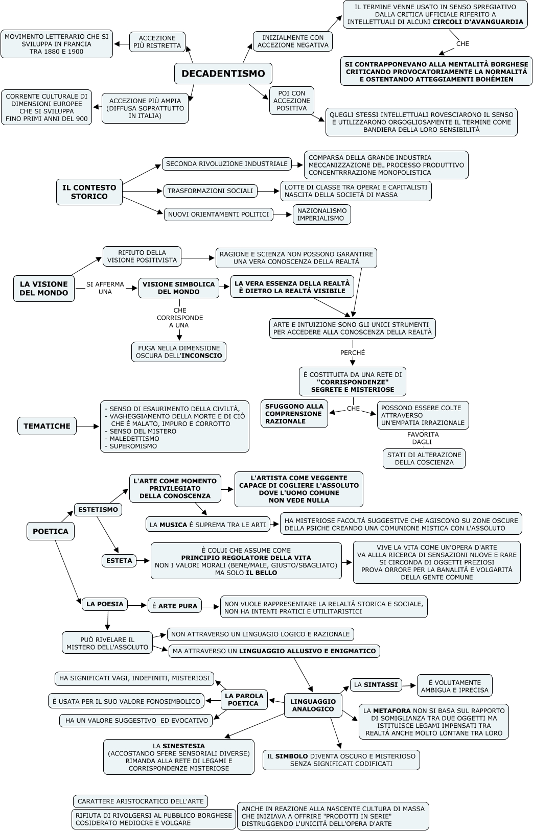 Questa Cmap, creata con IHMC CmapTools, contiene informazioni relative a: DECADENTISMO, VISIONE SIMBOLICA DEL MONDO ???? LA VERA ESSENZA DELLA REALTÀ È DIETRO LA REALTÀ VISIBILE, ESTETA ???? È COLUI CHE ASSUME COME PRINCIPIO REGOLATORE DELLA VITA NON I VALORI MORALI (BENE/MALE, GIUSTO/SBAGLIATO) MA SOLO IL BELLO, PUÒ RIVELARE IL MISTERO DELL'ASSOLUTO ???? MA ATTRAVERSO UN LINGUAGGIO ALLUSIVO E ENIGMATICO, ESTETISMO ???? ESTETA, LINGUAGGIO ANALOGICO ???? LA SINESTESIA (ACCOSTANDO SFERE SENSORIALI DIVERSE) RIMANDA ALLA RETE DI LEGAMI E CORRISPONDENZE MISTERIOSE, LA VISIONE DEL MONDO ???? RIFIUTO DELLA VISIONE POSITIVISTA, POSSONO ESSERE COLTE ATTRAVERSO UN'EMPATIA IRRAZIONALE FAVORITA DAGLI STATI DI ALTERAZIONE DELLA COSCIENZA, IL TERMINE VENNE USATO IN SENSO SPREGIATIVO DALLA CRITICA UFFICIALE RIFERITO A INTELLETTUALI DI ALCUNI CIRCOLI D'AVANGUARDIA CHE SI CONTRAPPONEVANO ALLA MENTALITÀ BORGHESE CRITICANDO PROVOCATORIAMENTE LA NORMALITÀ E OSTENTANDO ATTEGGIAMENTI BOHÉMIEN, IL CONTESTO STORICO ???? SECONDA RIVOLUZIONE INDUSTRIALE, TRASFORMAZIONI SOCIALI ???? LOTTE DI CLASSE TRA OPERAI E CAPITALISTI NASCITA DELLA SOCIETÀ DI MASSA, ESTETISMO ???? L'ARTE COME MOMENTO PRIVILEGIATO DELLA CONOSCENZA, LINGUAGGIO ANALOGICO ???? LA PAROLA POETICA, DECADENTISMO ???? POI CON ACCEZIONE POSITIVA, IL CONTESTO STORICO ???? NUOVI ORIENTAMENTI POLITICI, TEMATICHE ???? - SENSO DI ESAURIMENTO DELLA CIVILTÀ, - VAGHEGGIAMENTO DELLA MORTE E DI CIÒ CHE È MALATO, IMPURO E CORROTTO - SENSO DEL MISTERO - MALEDETTISMO - SUPEROMISMO, DECADENTISMO ???? ACCEZIONE PIÙ AMPIA (DIFFUSA SOPRATTUTTO IN ITALIA), LINGUAGGIO ANALOGICO ???? IL SIMBOLO DIVENTA OSCURO E MISTERIOSO SENZA SIGNIFICATI CODIFICATI, VISIONE SIMBOLICA DEL MONDO CHE CORRISPONDE A UNA FUGA NELLA DIMENSIONE OSCURA DELL'INCONSCIO, LA VISIONE DEL MONDO SI AFFERMA UNA VISIONE SIMBOLICA DEL MONDO, LINGUAGGIO ANALOGICO ???? LA SINTASSI