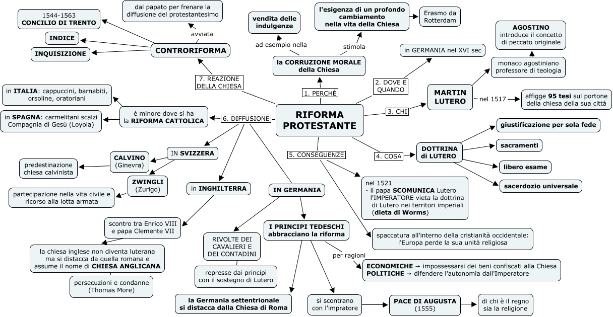 Questa Cmap, creata con IHMC CmapTools, contiene informazioni relative a: LA RIFORMA PROTESTANTE, DOTTRINA di LUTERO ???? sacerdozio universale, scontro tra Enrico VIII e papa Clemente VII ???? la chiesa inglese non diventa luterana ma si distacca da quella romana e assume il nome di CHIESA ANGLICANA, DOTTRINA di LUTERO ???? sacramenti, IN SVIZZERA ???? CALVINO (Ginevra), RIFORMA PROTESTANTE 6. DIFFUSIONE IN SVIZZERA, DOTTRINA di LUTERO ???? libero esame, I PRINCIPI TEDESCHI abbracciano la riforma ???? si scontrano con l'impratore, ZWINGLI (Zurigo) ???? partecipazione nella vita civile e ricorso alla lotta armata, CALVINO (Ginevra) ???? predestinazione chiesa calvinista, in INGHILTERRA ???? scontro tra Enrico VIII e papa Clemente VII, PACE DI AUGUSTA (1555) ???? di chi è il regno sia la religione, I PRINCIPI TEDESCHI abbracciano la riforma ???? la Germania settentrionale si distacca dalla Chiesa di Roma, RIFORMA PROTESTANTE 4. COSA DOTTRINA di LUTERO, CONTRORIFORMA ???? 1544-1563 CONCILIO DI TRENTO, CONTRORIFORMA ???? INQUISIZIONE, MARTIN LUTERO ???? monaco agostiniano professore di teologia, la CORRUZIONE MORALE della Chiesa ad esempio nella vendita delle indulgenze, è minore dove si ha la RIFORMA CATTOLICA ???? in SPAGNA: carmelitani scalzi Compagnia di Gesù (Loyola), l'esigenza di un profondo cambiamento nella vita della Chiesa ???? Erasmo da Rotterdam, si scontrano con l'impratore ???? PACE DI AUGUSTA (1555)