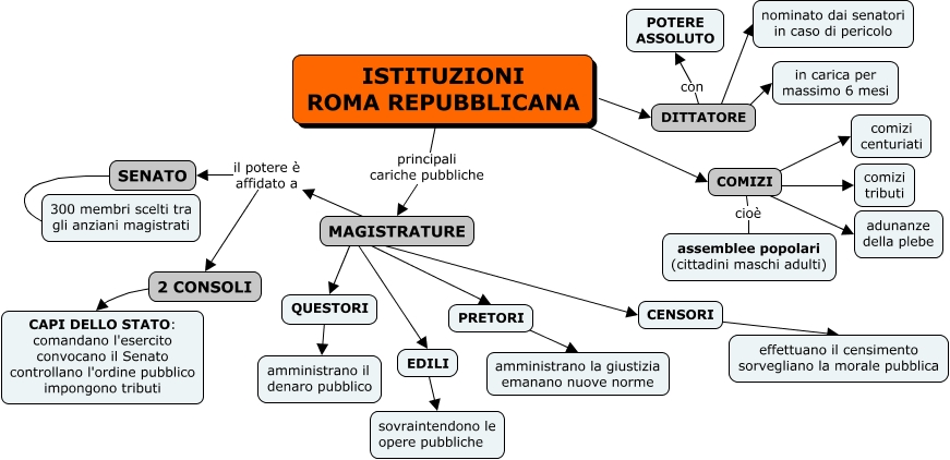 Questa Cmap, creata con IHMC CmapTools, contiene informazioni relative a: ISTITUZIONI ROMA REPUBBLICANA, COMIZI ???? comizi centuriati, MAGISTRATURE ???? QUESTORI, DITTATORE ???? in carica per massimo 6 mesi, MAGISTRATURE il potere è affidato a 2 CONSOLI, MAGISTRATURE ???? EDILI, MAGISTRATURE ???? CENSORI, COMIZI ???? comizi tributi, CENSORI ???? effettuano il censimento sorvegliano la morale pubblica, DITTATORE con POTERE ASSOLUTO, ISTITUZIONI ROMA REPUBBLICANA ???? DITTATORE, MAGISTRATURE il potere è affidato a SENATO, COMIZI cioè assemblee popolari (cittadini maschi adulti), 2 CONSOLI ???? CAPI DELLO STATO: comandano l'esercito convocano il Senato controllano l'ordine pubblico impongono tributi, EDILI ???? sovraintendono le opere pubbliche, QUESTORI ???? amministrano il denaro pubblico, DITTATORE ???? nominato dai senatori in caso di pericolo, SENATO ???? 300 membri scelti tra gli anziani magistrati, COMIZI ???? adunanze della plebe, MAGISTRATURE ???? PRETORI, ISTITUZIONI ROMA REPUBBLICANA ???? COMIZI