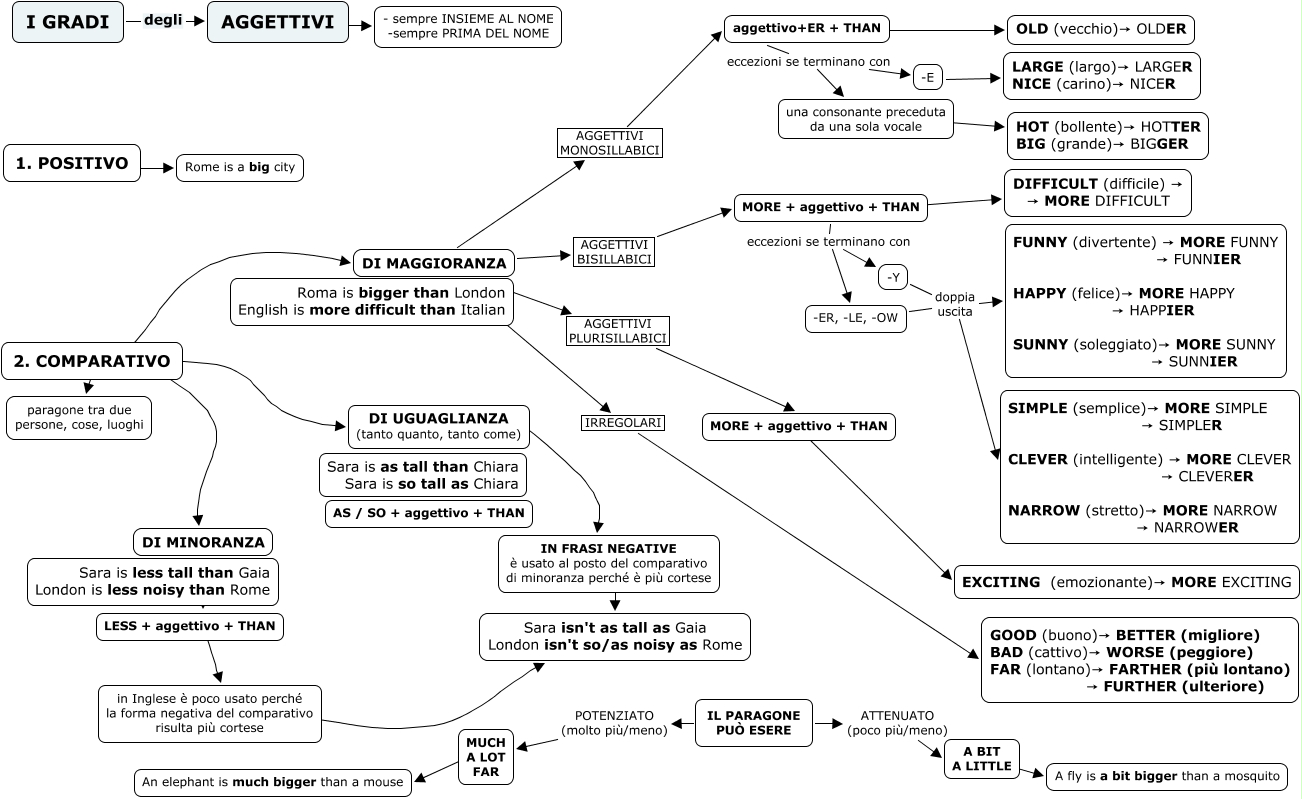Questa Cmap, creata con IHMC CmapTools, contiene informazioni relative a: GRADI AGGETTIVI bis, -E ???? LARGE (largo)→ LARGER NICE (carino)→ NICER, DI MAGGIORANZA AGGETTIVI BISILLABICI MORE + aggettivo + THAN, MORE + aggettivo + THAN ???? EXCITING (emozionante)→ MORE EXCITING, 2. COMPARATIVO ???? DI MAGGIORANZA, in Inglese è poco usato perché la forma negativa del comparativo risulta più cortese ???? Sara isn't as tall as Gaia London isn't so/as noisy as Rome, aggettivo+ER + THAN ???? OLD (vecchio)→ OLDER, DI MAGGIORANZA AGGETTIVI MONOSILLABICI aggettivo+ER + THAN, A BIT A LITTLE ???? A fly is a bit bigger than a mosquito, 1. POSITIVO ???? Rome is a big city, -Y doppia uscita FUNNY (divertente) → MORE FUNNY → FUNNIER HAPPY (felice)→ MORE HAPPY → HAPPIER SUNNY (soleggiato)→ MORE SUNNY → SUNNIER, 2. COMPARATIVO ???? DI UGUAGLIANZA (tanto quanto, tanto come), IL PARAGONE PUÒ ESERE POTENZIATO (molto più/meno) MUCH A LOT FAR, DI MAGGIORANZA AGGETTIVI PLURISILLABICI MORE + aggettivo + THAN, DI MINORANZA ???? in Inglese è poco usato perché la forma negativa del comparativo risulta più cortese, MORE + aggettivo + THAN ???? DIFFICULT (difficile) → → MORE DIFFICULT, 2. COMPARATIVO ???? DI MINORANZA, -ER, -LE, -OW doppia uscita FUNNY (divertente) → MORE FUNNY → FUNNIER HAPPY (felice)→ MORE HAPPY → HAPPIER SUNNY (soleggiato)→ MORE SUNNY → SUNNIER, -Y doppia uscita SIMPLE (semplice)→ MORE SIMPLE → SIMPLER CLEVER (intelligente) → MORE CLEVER → CLEVERER NARROW (stretto)→ MORE NARROW → NARROWER, aggettivo+ER + THAN eccezioni se terminano con -E, una consonante preceduta da una sola vocale ???? HOT (bollente)→ HOTTER BIG (grande)→ BIGGER