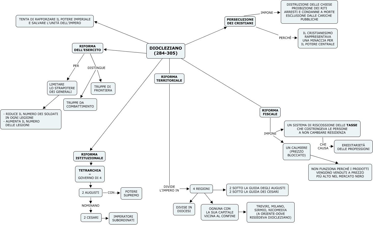 Questa Cmap, creata con IHMC CmapTools, contiene informazioni relative a: DIOCLEZIANO PER IMMAGINI, DIOCLEZIANO (284-305) ???? PERSECUZIONE DEI CRISTIANI, RIFORMA FISCALE IMPONE UN SISTEMA DI RISCOSSIONE DELLE TASSE CHE COSTRINGEVA LE PERSONE A NON CAMBIARE RESIDENZA, RIFORMA DELL'ESERCITO PER LIMITARE LO STRAPOTERE DEI GENERALI, DIOCLEZIANO (284-305) ???? RIFORMA TERRITORIALE, LIMITARE LO STRAPOTERE DEI GENERALI ???? - RIDUCE IL NUMERO DEI SOLDATI IN OGNI LEGIONE - AUMENTA IL NUMERO DELLE LEGIONI, PERSECUZIONE DEI CRISTIANI PERCHÉ IL CRISTIANESIMO RAPPRESENTAVA UNA MINACCIA PER IL POTERE CENTRALE, 4 REGIONI ???? DIVISE IN DIOCESI, DIOCLEZIANO (284-305) ???? TENTA DI RAFFORZARE IL POTERE IMPERIALE E SALVARE L'UNITÀ DELL'IMPERO, 2 CESARI ???? IMPERATORI SUBORDINATI, UN CALMIERE (PREZZO BLOCCATO) ???? NON FUNZIONA PERCHÉ I PRODOTTI VENGONO VENDUTI A PREZZO PIÙ ALTO NEL MERCATO NERO, 4 REGIONI ???? OGNUNA CON LA SUA CAPITALE VICINA AL CONFINE, OGNUNA CON LA SUA CAPITALE VICINA AL CONFINE ???? TREVIRI, MILANO, SIRMIO, NICOMEDIA (A ORIENTE-DOVE RISIEDEVA DIOCLEZIANO), TETRARCHIA = GOVERNO DI 4 ???? 2 AUGUSTI, PERSECUZIONE DEI CRISTIANI IMPONE DISTRUZIONE DELLE CHIESE PROIBIZIONE DEI RITI ARRESTI E CONDANNE A MORTE ESCLUSIONE DALLE CARICHE PUBBLICHE, 2 AUGUSTI CON POTERE SUPREMO, RIFORMA TERRITORIALE DIVIDE L'IMPERO IN 4 REGIONI, DIOCLEZIANO (284-305) ???? RIFORMA ISTITUZIONALE, UN SISTEMA DI RISCOSSIONE DELLE TASSE CHE COSTRINGEVA LE PERSONE A NON CAMBIARE RESIDENZA CHE CAUSA EREDITARIETÀ DELLE PROFESSIONI, RIFORMA DELL'ESERCITO DISTINGUE TRUPPE DI FRONTIERA, DIOCLEZIANO (284-305) ???? RIFORMA DELL'ESERCITO