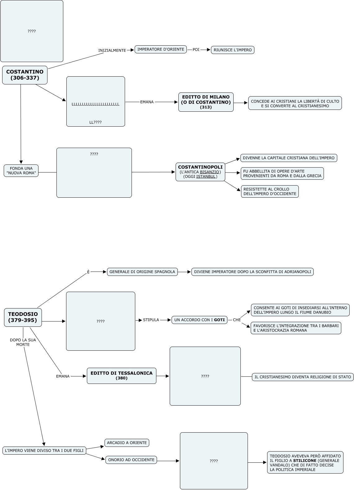 Questa Cmap, creata con IHMC CmapTools, contiene informazioni relative a: COSTANTINO E TEODOSIO PER IMMAGINI, FONDA UNA "NUOVA ROMA" ???? COSTANTINOPOLI (L'ANTICA BISANZIO) (OGGI ISTANBUL), TEODOSIO (379-395) EMANA EDITTO DI TESSALONICA (380), GENERALE DI ORIGINE SPAGNOLA ???? DIVIENE IMPERATORE DOPO LA SCONFITTA DI ADRIANOPOLI, COSTANTINO (306-337) INIZIALMENTE IMPERATORE D'ORIENTE, TEODOSIO (379-395) ???? ????, TEODOSIO (379-395) È GENERALE DI ORIGINE SPAGNOLA, UN ACCORDO CON I GOTI CHE CONSENTE AI GOTI DI INSEDIARSI ALL'INTERNO DELL'IMPERO LUNGO IL FIUME DANUBIO, COSTANTINOPOLI (L'ANTICA BISANZIO) (OGGI ISTANBUL) ???? RESISTETTE AL CROLLO DELL'IMPERO D'OCCIDENTE, COSTANTINO (306-337) ???? FONDA UNA "NUOVA ROMA", EDITTO DI MILANO (O DI COSTANTINO) (313) ???? CONCEDE AI CRISTIANI LA LIBERTÀ DI CULTO E SI CONVERTE AL CRISTIANESIMO, L'IMPERO VIENE DIVISO TRA I DUE FIGLI ???? ARCADIO A ORIENTE, ???? STIPULA UN ACCORDO CON I GOTI, COSTANTINOPOLI (L'ANTICA BISANZIO) (OGGI ISTANBUL) ???? DIVENNE LA CAPITALE CRISTIANA DELL'IMPERO, ???? ???? TEODOSIO AVEVEVA PERÒ AFFIDATO IL FIGLIO A STILICONE (GENERALE VANDALO) CHE DI FATTO DECISE LA POLITICA IMPERIALE, L'IMPERO VIENE DIVISO TRA I DUE FIGLI ???? ONORIO AD OCCIDENTE, ONORIO AD OCCIDENTE ???? ????, UN ACCORDO CON I GOTI CHE FAVORISCE L'INTEGRAZIONE TRA I BARBARI E L'ARISTOCRAZIA ROMANA, COSTANTINOPOLI (L'ANTICA BISANZIO) (OGGI ISTANBUL) ???? FU ABBELLITA DI OPERE D'ARTE PROVENIENTI DA ROMA E DALLA GRECIA, TEODOSIO (379-395) DOPO LA SUA MORTE L'IMPERO VIENE DIVISO TRA I DUE FIGLI, EDITTO DI TESSALONICA (380) ???? ????