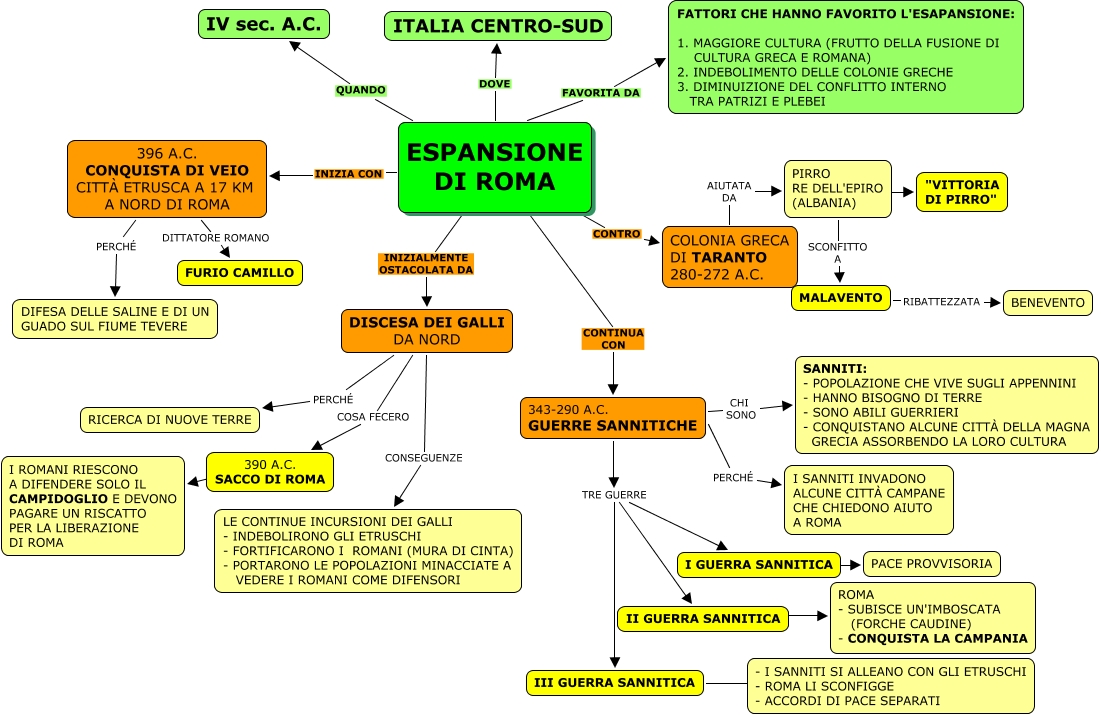 Questa Cmap, creata con IHMC CmapTools, contiene informazioni relative a: espansione di roma COLORI, ESPANSIONE DI ROMA DOVE ITALIA CENTRO-SUD, ESPANSIONE DI ROMA FAVORITA DA FATTORI CHE HANNO FAVORITO L'ESAPANSIONE: 1. MAGGIORE CULTURA (FRUTTO DELLA FUSIONE DI CULTURA GRECA E ROMANA) 2. INDEBOLIMENTO DELLE COLONIE GRECHE 3. DIMINUIZIONE DEL CONFLITTO INTERNO TRA PATRIZI E PLEBEI, 343-290 A.C. GUERRE SANNITICHE CHI SONO SANNITI: - POPOLAZIONE CHE VIVE SUGLI APPENNINI - HANNO BISOGNO DI TERRE - SONO ABILI GUERRIERI - CONQUISTANO ALCUNE CITTÀ DELLA MAGNA GRECIA ASSORBENDO LA LORO CULTURA, MALAVENTO RIBATTEZZATA BENEVENTO, 396 A.C. CONQUISTA DI VEIO CITTÀ ETRUSCA A 17 KM A NORD DI ROMA DITTATORE ROMANO FURIO CAMILLO, DISCESA DEI GALLI DA NORD PERCHÉ RICERCA DI NUOVE TERRE, 390 A.C. SACCO DI ROMA ???? I ROMANI RIESCONO A DIFENDERE SOLO IL CAMPIDOGLIO E DEVONO PAGARE UN RISCATTO PER LA LIBERAZIONE DI ROMA, 343-290 A.C. GUERRE SANNITICHE TRE GUERRE II GUERRA SANNITICA, PIRRO RE DELL'EPIRO (ALBANIA) SCONFITTO A MALAVENTO, 396 A.C. CONQUISTA DI VEIO CITTÀ ETRUSCA A 17 KM A NORD DI ROMA PERCHÉ DIFESA DELLE SALINE E DI UN GUADO SUL FIUME TEVERE, DISCESA DEI GALLI DA NORD COSA FECERO 390 A.C. SACCO DI ROMA, 343-290 A.C. GUERRE SANNITICHE TRE GUERRE III GUERRA SANNITICA, ESPANSIONE DI ROMA QUANDO IV sec. A.C., I GUERRA SANNITICA ???? PACE PROVVISORIA, ESPANSIONE DI ROMA INIZIA CON 396 A.C. CONQUISTA DI VEIO CITTÀ ETRUSCA A 17 KM A NORD DI ROMA, PIRRO RE DELL'EPIRO (ALBANIA) ???? "VITTORIA DI PIRRO", III GUERRA SANNITICA ???? - I SANNITI SI ALLEANO CON GLI ETRUSCHI - ROMA LI SCONFIGGE - ACCORDI DI PACE SEPARATI, 343-290 A.C. GUERRE SANNITICHE TRE GUERRE I GUERRA SANNITICA, ESPANSIONE DI ROMA CONTRO COLONIA GRECA DI TARANTO 280-272 A.C., ESPANSIONE DI ROMA CONTINUA CON 343-290 A.C. GUERRE SANNITICHE