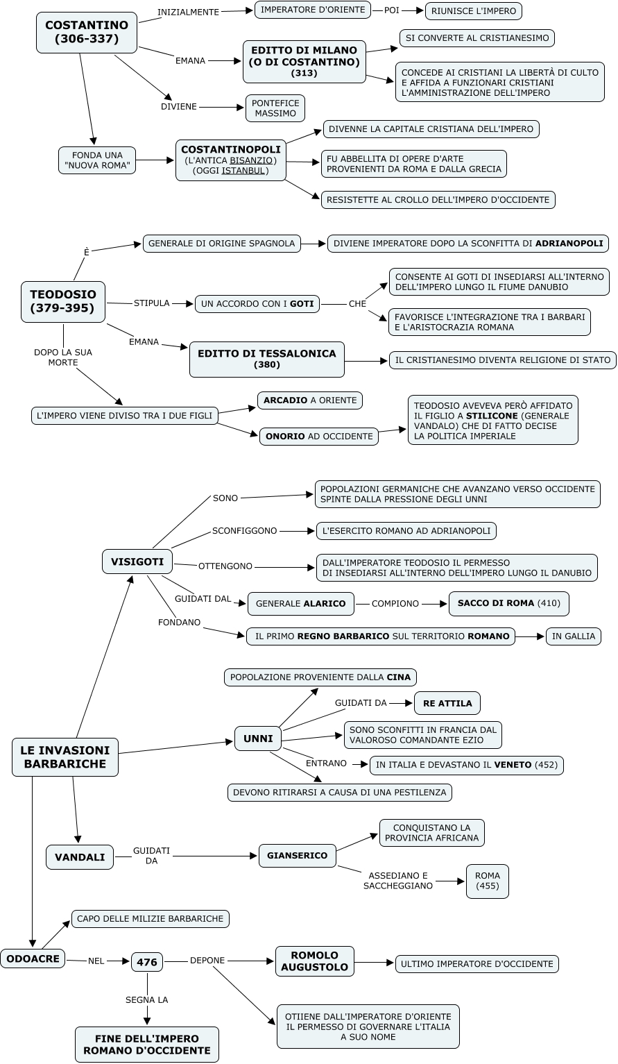 Questa Cmap, creata con IHMC CmapTools, contiene informazioni relative a: epoca tardoantica 2, VISIGOTI SONO POPOLAZIONI GERMANICHE CHE AVANZANO VERSO OCCIDENTE SPINTE DALLA PRESSIONE DEGLI UNNI, FONDA UNA "NUOVA ROMA" ???? COSTANTINOPOLI (L'ANTICA BISANZIO) (OGGI ISTANBUL), UNNI ???? POPOLAZIONE PROVENIENTE DALLA CINA, LE INVASIONI BARBARICHE ???? ODOACRE, VISIGOTI SCONFIGGONO L'ESERCITO ROMANO AD ADRIANOPOLI, COSTANTINOPOLI (L'ANTICA BISANZIO) (OGGI ISTANBUL) ???? FU ABBELLITA DI OPERE D'ARTE PROVENIENTI DA ROMA E DALLA GRECIA, VANDALI GUIDATI DA GIANSERICO, COSTANTINOPOLI (L'ANTICA BISANZIO) (OGGI ISTANBUL) ???? RESISTETTE AL CROLLO DELL'IMPERO D'OCCIDENTE, TEODOSIO (379-395) È GENERALE DI ORIGINE SPAGNOLA, ODOACRE ???? CAPO DELLE MILIZIE BARBARICHE, UNNI ENTRANO IN ITALIA E DEVASTANO IL VENETO (452), TEODOSIO (379-395) DOPO LA SUA MORTE L'IMPERO VIENE DIVISO TRA I DUE FIGLI, L'IMPERO VIENE DIVISO TRA I DUE FIGLI ???? ONORIO AD OCCIDENTE, IL PRIMO REGNO BARBARICO SUL TERRITORIO ROMANO ???? IN GALLIA, LE INVASIONI BARBARICHE ???? VANDALI, EDITTO DI MILANO (O DI COSTANTINO) (313) ???? CONCEDE AI CRISTIANI LA LIBERTÀ DI CULTO E AFFIDA A FUNZIONARI CRISTIANI L'AMMINISTRAZIONE DELL'IMPERO, COSTANTINO (306-337) INIZIALMENTE IMPERATORE D'ORIENTE, COSTANTINOPOLI (L'ANTICA BISANZIO) (OGGI ISTANBUL) ???? DIVENNE LA CAPITALE CRISTIANA DELL'IMPERO, TEODOSIO (379-395) STIPULA UN ACCORDO CON I GOTI, UN ACCORDO CON I GOTI CHE CONSENTE AI GOTI DI INSEDIARSI ALL'INTERNO DELL'IMPERO LUNGO IL FIUME DANUBIO