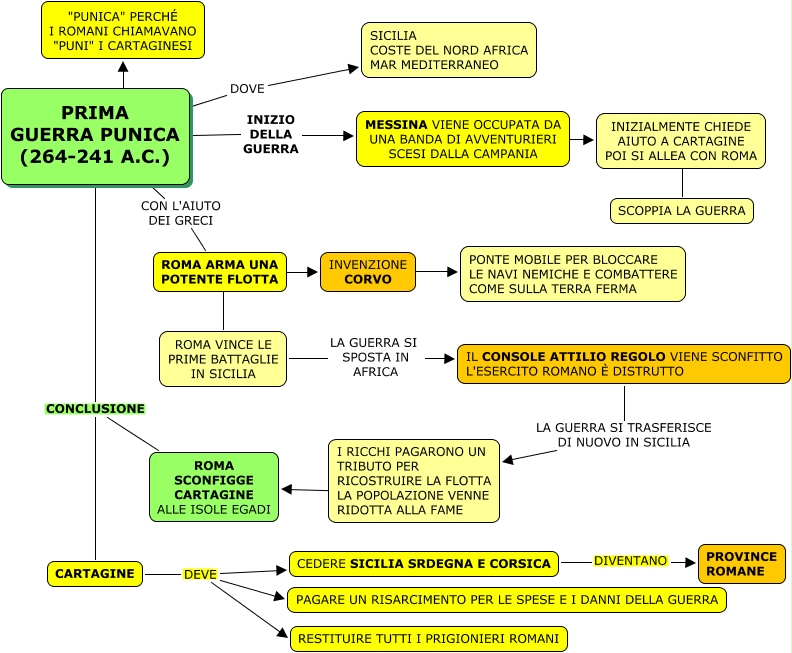 Questa Cmap, creata con IHMC CmapTools, contiene informazioni relative a: guerre puniche 1, IL CONSOLE ATTILIO REGOLO VIENE SCONFITTO L'ESERCITO ROMANO È DISTRUTTO LA GUERRA SI TRASFERISCE DI NUOVO IN SICILIA I RICCHI PAGARONO UN TRIBUTO PER RICOSTRUIRE LA FLOTTA LA POPOLAZIONE VENNE RIDOTTA ALLA FAME, ROMA VINCE LE PRIME BATTAGLIE IN SICILIA LA GUERRA SI SPOSTA IN AFRICA IL CONSOLE ATTILIO REGOLO VIENE SCONFITTO L'ESERCITO ROMANO È DISTRUTTO, MESSINA VIENE OCCUPATA DA UNA BANDA DI AVVENTURIERI SCESI DALLA CAMPANIA ???? INIZIALMENTE CHIEDE AIUTO A CARTAGINE POI SI ALLEA CON ROMA, PRIMA GUERRA PUNICA (264-241 A.C.) ???? "PUNICA" PERCHÉ I ROMANI CHIAMAVANO "PUNI" I CARTAGINESI, CARTAGINE DEVE PAGARE UN RISARCIMENTO PER LE SPESE E I DANNI DELLA GUERRA, CARTAGINE DEVE RESTITUIRE TUTTI I PRIGIONIERI ROMANI, PRIMA GUERRA PUNICA (264-241 A.C.) DOVE SICILIA COSTE DEL NORD AFRICA MAR MEDITERRANEO, I RICCHI PAGARONO UN TRIBUTO PER RICOSTRUIRE LA FLOTTA LA POPOLAZIONE VENNE RIDOTTA ALLA FAME ???? ROMA SCONFIGGE CARTAGINE ALLE ISOLE EGADI, ROMA ARMA UNA POTENTE FLOTTA ???? INVENZIONE CORVO, CARTAGINE DEVE CEDERE SICILIA SRDEGNA E CORSICA, PRIMA GUERRA PUNICA (264-241 A.C.) CONCLUSIONE CARTAGINE, CEDERE SICILIA SRDEGNA E CORSICA DIVENTANO PROVINCE ROMANE, INIZIALMENTE CHIEDE AIUTO A CARTAGINE POI SI ALLEA CON ROMA ???? SCOPPIA LA GUERRA, ROMA ARMA UNA POTENTE FLOTTA ???? ROMA VINCE LE PRIME BATTAGLIE IN SICILIA, PRIMA GUERRA PUNICA (264-241 A.C.) CONCLUSIONE ROMA SCONFIGGE CARTAGINE ALLE ISOLE EGADI, PRIMA GUERRA PUNICA (264-241 A.C.) CON L'AIUTO DEI GRECI ROMA ARMA UNA POTENTE FLOTTA, INVENZIONE CORVO ???? PONTE MOBILE PER BLOCCARE LE NAVI NEMICHE E COMBATTERE COME SULLA TERRA FERMA, PRIMA GUERRA PUNICA (264-241 A.C.) INIZIO DELLA GUERRA MESSINA VIENE OCCUPATA DA UNA BANDA DI AVVENTURIERI SCESI DALLA CAMPANIA