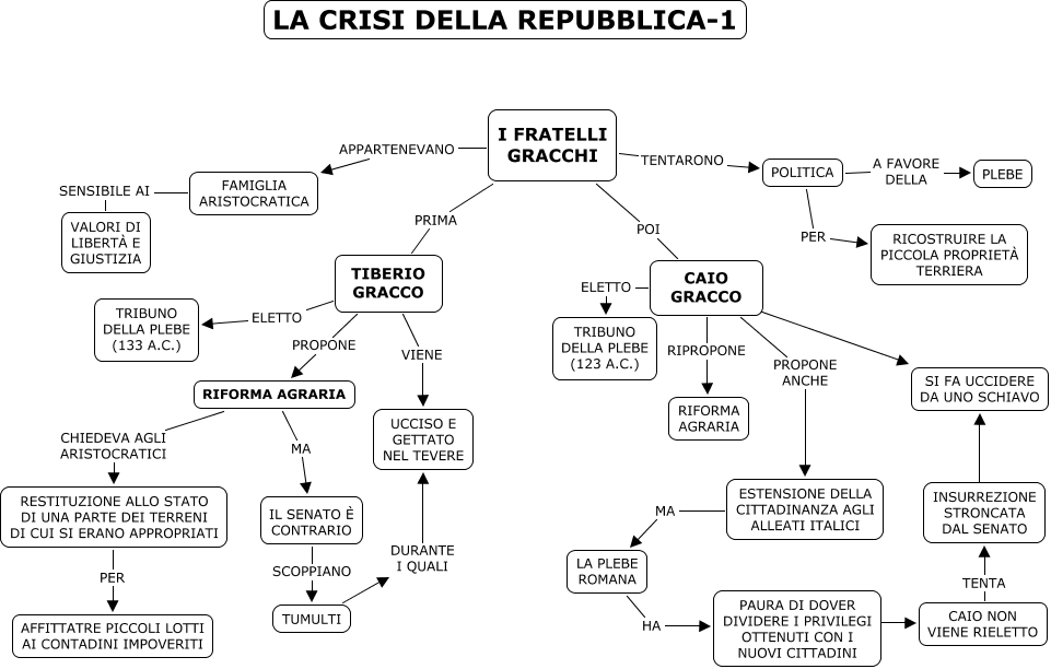 Questa Cmap, creata con IHMC CmapTools, contiene informazioni relative a: la crisi della repubblica, ESTENSIONE DELLA CITTADINANZA AGLI ALLEATI ITALICI MA LA PLEBE ROMANA, CAIO GRACCO RIPROPONE RIFORMA AGRARIA, INSURREZIONE STRONCATA DAL SENATO ???? SI FA UCCIDERE DA UNO SCHIAVO, POLITICA A FAVORE DELLA PLEBE, I FRATELLI GRACCHI POI CAIO GRACCO, FAMIGLIA ARISTOCRATICA SENSIBILE AI VALORI DI LIBERTÀ E GIUSTIZIA, PAURA DI DOVER DIVIDERE I PRIVILEGI OTTENUTI CON I NUOVI CITTADINI ???? CAIO NON VIENE RIELETTO, POLITICA PER RICOSTRUIRE LA PICCOLA PROPRIETÀ TERRIERA, CAIO GRACCO ELETTO TRIBUNO DELLA PLEBE (123 A.C.), IL SENATO È CONTRARIO SCOPPIANO TUMULTI, LA PLEBE ROMANA HA PAURA DI DOVER DIVIDERE I PRIVILEGI OTTENUTI CON I NUOVI CITTADINI, CAIO GRACCO ???? SI FA UCCIDERE DA UNO SCHIAVO, RIFORMA AGRARIA CHIEDEVA AGLI ARISTOCRATICI RESTITUZIONE ALLO STATO DI UNA PARTE DEI TERRENI DI CUI SI ERANO APPROPRIATI, TIBERIO GRACCO PROPONE RIFORMA AGRARIA, TIBERIO GRACCO VIENE UCCISO E GETTATO NEL TEVERE, RIFORMA AGRARIA MA IL SENATO È CONTRARIO, TIBERIO GRACCO ELETTO TRIBUNO DELLA PLEBE (133 A.C.), I FRATELLI GRACCHI TENTARONO POLITICA, CAIO GRACCO PROPONE ANCHE ESTENSIONE DELLA CITTADINANZA AGLI ALLEATI ITALICI, CAIO NON VIENE RIELETTO TENTA INSURREZIONE STRONCATA DAL SENATO