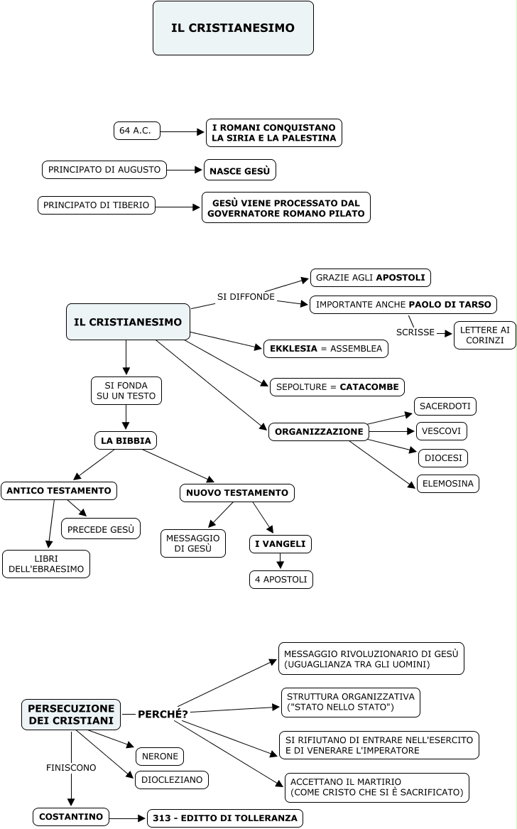 Questa Cmap, creata con IHMC CmapTools, contiene informazioni relative a: cristianesimo, 64 A.C. ???? I ROMANI CONQUISTANO LA SIRIA E LA PALESTINA, SI FONDA SU UN TESTO ???? LA BIBBIA, LA BIBBIA ???? NUOVO TESTAMENTO, PRINCIPATO DI AUGUSTO ???? NASCE GESÙ, NUOVO TESTAMENTO ???? MESSAGGIO DI GESÙ, PERSECUZIONE DEI CRISTIANI FINISCONO COSTANTINO, I VANGELI ???? 4 APOSTOLI, COSTANTINO ???? 313 - EDITTO DI TOLLERANZA, NUOVO TESTAMENTO ???? I VANGELI, IL CRISTIANESIMO ???? SI FONDA SU UN TESTO, ANTICO TESTAMENTO ???? PRECEDE GESÙ, IL CRISTIANESIMO ???? EKKLESIA = ASSEMBLEA, IL CRISTIANESIMO ???? SEPOLTURE = CATACOMBE, PERSECUZIONE DEI CRISTIANI PERCHÉ? ACCETTANO IL MARTIRIO (COME CRISTO CHE SI È SACRIFICATO), ORGANIZZAZIONE ???? DIOCESI, PERSECUZIONE DEI CRISTIANI PERCHÉ? MESSAGGIO RIVOLUZIONARIO DI GESÙ (UGUAGLIANZA TRA GLI UOMINI), IL CRISTIANESIMO SI DIFFONDE GRAZIE AGLI APOSTOLI, PERSECUZIONE DEI CRISTIANI PERCHÉ? STRUTTURA ORGANIZZATIVA ("STATO NELLO STATO"), IMPORTANTE ANCHE PAOLO DI TARSO SCRISSE LETTERE AI CORINZI, ORGANIZZAZIONE ???? VESCOVI
