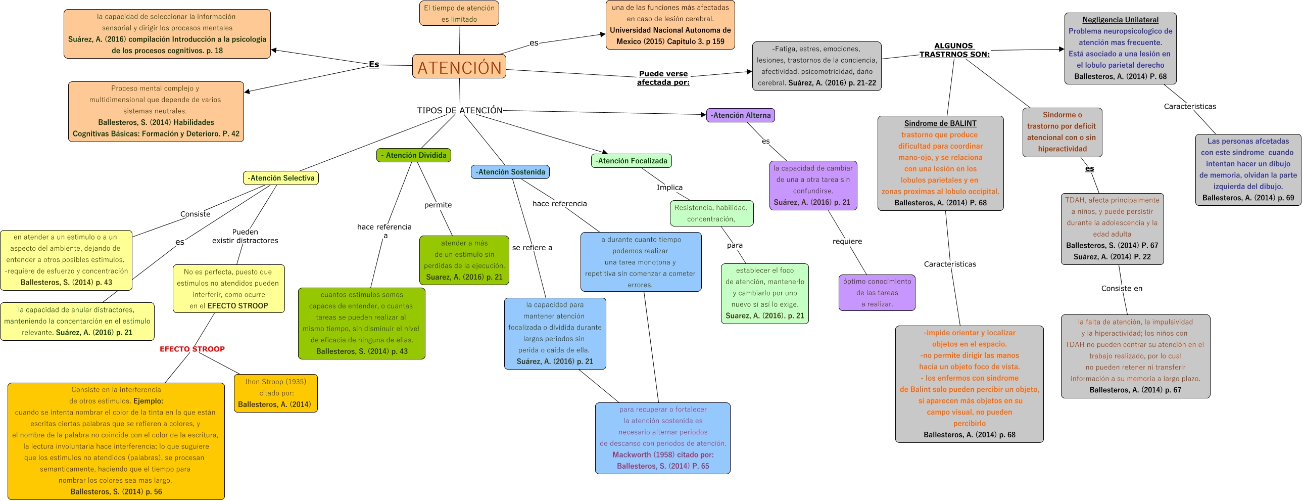 Este Cmap, tiene información relacionada con: ATENCIÓN, -Atención Selectiva es la capacidad de anular distractores, manteniendo la concentarción en el estimulo relevante. Suárez, A. (2016) p. 21, TDAH, afecta principalmente a niños, y puede persistir durante la adolescencia y la edad adulta Ballesteros, S. (2014) P. 67 Suárez, A. (2014) P. 22 Consiste en la falta de atención, la impulsividad y la hiperactividad; los niños con TDAH no pueden centrar su atención en el trabajo realizado, por lo cual no pueden retener ni transferir información a su memoria a largo plazo. Ballesteros, A. (2014) p. 67, Sindrome de BALINT trastorno que produce dificultad para coordinar mano-ojo, y se relaciona con una lesión en los lobulos parietales y en zonas proximas al lobulo occipital. Ballesteros, A. (2014) P. 68 Caracteristicas -impide orientar y localizar objetos en el espacio. -no permite dirigir las manos hacia un objeto foco de vista. - los enfermos con sindrome de Balint solo pueden percibir un objeto, si aparecen más objetos en su campo visual, no pueden percibirlo Ballesteros, A. (2014) p. 68, -Atención Sostenida se refiere a la capacidad para mantener atención focalizada o dividida durante largos periodos sin perida o caida de ella. Suárez, A. (2016) p. 21, No es perfecta, puesto que estimulos no atendidos pueden interferir, como ocurre en el EFECTO STROOP EFECTO STROOP Consiste en la interferencia de otros estimulos. Ejemplo: cuando se intenta nombrar el color de la tinta en la que están escritas ciertas palabras que se refieren a colores, y el nombre de la palabra no coincide con el color de la escritura, la lectura involuntaria hace interferencia; lo que suguiere que los estimulos no atendidos (palabras), se procesan semanticamente, haciendo que el tiempo para nombrar los colores sea mas largo. Ballesteros, S. (2014) p. 56, ATENCIÓN TIPOS DE ATENCIÓN -Atención Selectiva, No es perfecta, puesto que estimulos no atendidos pueden interferir, como ocurre en el EFECTO STROOP EFECTO STROOP Jhon Stroop (1935) citado por: Ballesteros, A. (2014), ATENCIÓN Es la capacidad de seleccionar la información sensorial y dirigir los procesos mentales Suárez, A. (2016) compilación Introducción a la psicología de los procesos cognitivos. p. 18, -Fatiga, estres, emociones, lesiones, trastornos de la conciencia, afectividad, psicomotricidad, daño cerebral. Suárez, A. (2016) p. 21-22 ALGUNOS TRASTRNOS SON: Sindorme o trastorno por deficit atencional con o sin hiperactividad, -Atención Alterna es la capacidad de cambiar de una a otra tarea sin confundirse. Suárez, A. (2016) p. 21, la capacidad de cambiar de una a otra tarea sin confundirse. Suárez, A. (2016) p. 21 requiere óptimo conocimiento de las tareas a realizar., ATENCIÓN TIPOS DE ATENCIÓN -Atención Focalizada, Sindorme o trastorno por deficit atencional con o sin hiperactividad es TDAH, afecta principalmente a niños, y puede persistir durante la adolescencia y la edad adulta Ballesteros, S. (2014) P. 67 Suárez, A. (2014) P. 22, - Atención Dividida permite atender a más de un estimulo sin perdidas de la ejecución. Suarez, A. (2016) p. 21, ATENCIÓN TIPOS DE ATENCIÓN - Atención Dividida, ATENCIÓN es una de las funciones más afectadas en caso de lesión cerebral. Universidad Nacional Autonoma de Mexico (2015) Capitulo 3. p 159, Resistencia, habilidad, concentración, para establecer el foco de atención, mantenerlo y cambiarlo por uno nuevo si así lo exige. Suarez, A. (2016). p. 21, a durante cuanto tiempo podemos realizar una tarea monotona y repetitiva sin comenzar a cometer errores. ???? para recuperar o fortalecer la atención sostenida es necesario alternar periodos de descanso con periodos de atención. Mackworth (1958) citado por: Ballesteros, S. (2014) P. 65, -Atención Focalizada Implica Resistencia, habilidad, concentración,, ATENCIÓN TIPOS DE ATENCIÓN -Atención Alterna