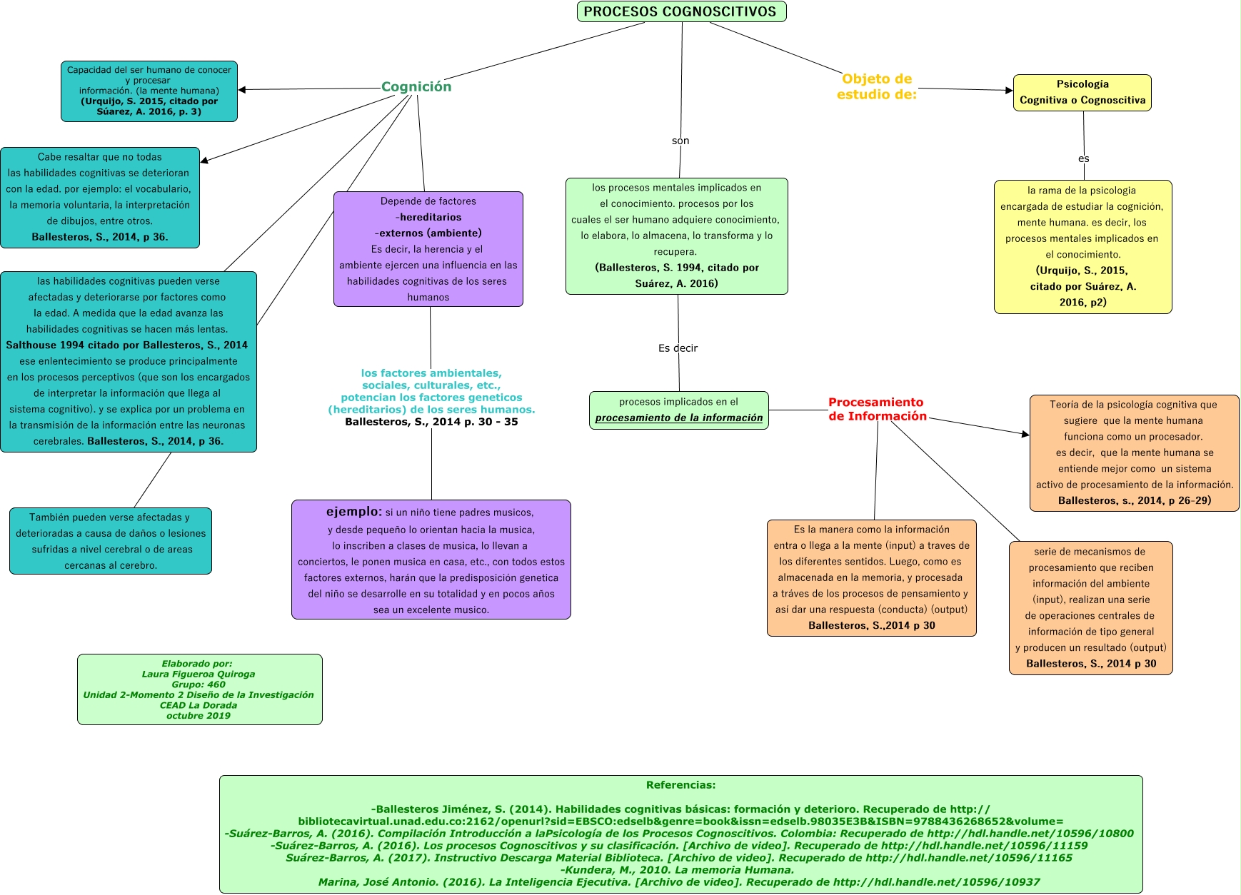 Este Cmap, tiene información relacionada con: Procesos Cognoscitivos, PROCESOS COGNOSCITIVOS Cognición También pueden verse afectadas y deterioradas a causa de daños o lesiones sufridas a nivel cerebral o de areas cercanas al cerebro., PROCESOS COGNOSCITIVOS Cognición Cabe resaltar que no todas las habilidades cognitivas se deterioran con la edad. por ejemplo: el vocabulario, la memoria voluntaria, la interpretación de dibujos, entre otros. Ballesteros, S., 2014, p 36., Depende de factores -hereditarios -externos (ambiente) Es decir, la herencia y el ambiente ejercen una influencia en las habilidades cognitivas de los seres humanos los factores ambientales, sociales, culturales, etc., potencian los factores geneticos (hereditarios) de los seres humanos. Ballesteros, S., 2014 p. 30 - 35 ejemplo: si un niño tiene padres musicos, y desde pequeño lo orientan hacia la musica, lo inscriben a clases de musica, lo llevan a conciertos, le ponen musica en casa, etc., con todos estos factores externos, harán que la predisposición genetica del niño se desarrolle en su totalidad y en pocos años sea un excelente musico., los procesos mentales implicados en el conocimiento. procesos por los cuales el ser humano adquiere conocimiento, lo elabora, lo almacena, lo transforma y lo recupera. (Ballesteros, S. 1994, citado por Suárez, A. 2016) Es decir procesos implicados en el procesamiento de la información, PROCESOS COGNOSCITIVOS son los procesos mentales implicados en el conocimiento. procesos por los cuales el ser humano adquiere conocimiento, lo elabora, lo almacena, lo transforma y lo recupera. (Ballesteros, S. 1994, citado por Suárez, A. 2016), procesos implicados en el procesamiento de la información Procesamiento de Información Teoría de la psicología cognitiva que sugiere que la mente humana funciona como un procesador. es decir, que la mente humana se entiende mejor como un sistema activo de procesamiento de la información. Ballesteros, s., 2014, p 26-29), PROCESOS COGNOSCITIVOS Cognición las habilidades cognitivas pueden verse afectadas y deteriorarse por factores como la edad. A medida que la edad avanza las habilidades cognitivas se hacen más lentas. Salthouse 1994 citado por Ballesteros, S., 2014 ese enlentecimiento se produce principalmente en los procesos perceptivos (que son los encargados de interpretar la información que llega al sistema cognitivo). y se explica por un problema en la transmisión de la información entre las neuronas cerebrales. Ballesteros, S., 2014, p 36., Psicología Cognitiva o Cognoscitiva es la rama de la psicologia encargada de estudiar la cognición, mente humana. es decir, los procesos mentales implicados en el conocimiento. (Urquijo, S., 2015, citado por Suárez, A. 2016, p2), procesos implicados en el procesamiento de la información Procesamiento de Información serie de mecanismos de procesamiento que reciben información del ambiente (input), realizan una serie de operaciones centrales de información de tipo general y producen un resultado (output) Ballesteros, S., 2014 p 30, PROCESOS COGNOSCITIVOS Cognición Depende de factores -hereditarios -externos (ambiente) Es decir, la herencia y el ambiente ejercen una influencia en las habilidades cognitivas de los seres humanos, PROCESOS COGNOSCITIVOS Cognición Capacidad del ser humano de conocer y procesar información. (la mente humana) (Urquijo, S. 2015, citado por Súarez, A. 2016, p. 3), PROCESOS COGNOSCITIVOS Objeto de estudio de: Psicología Cognitiva o Cognoscitiva, procesos implicados en el procesamiento de la información Procesamiento de Información Es la manera como la información entra o llega a la mente (input) a traves de los diferentes sentidos. Luego, como es almacenada en la memoria, y procesada a tráves de los procesos de pensamiento y así dar una respuesta (conducta) (output) Ballesteros, S.,2014 p 30