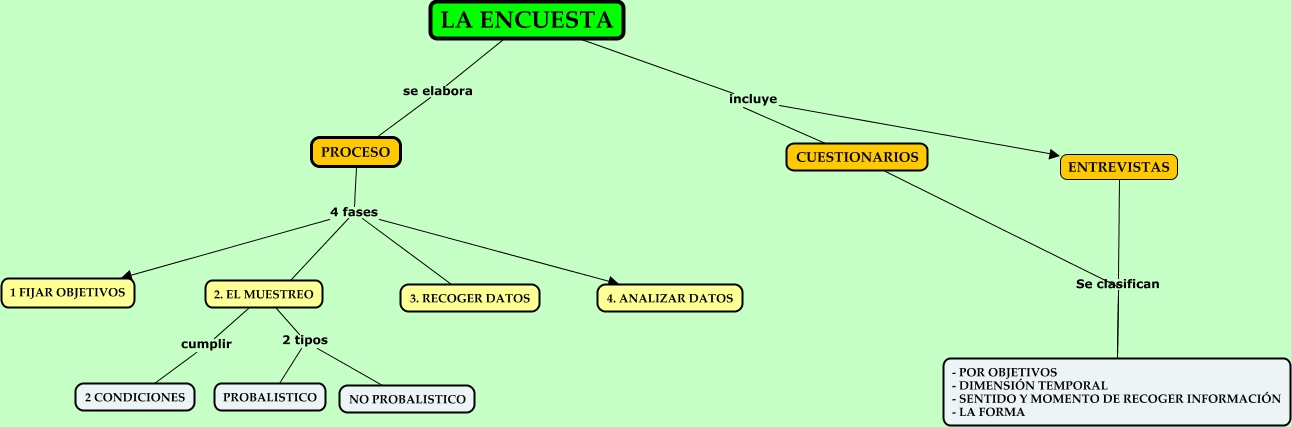 Este Cmap, tiene información relacionada con: Tema 2, ENTREVISTAS Se clasifican - POR OBJETIVOS - DIMENSIÓN TEMPORAL - SENTIDO Y MOMENTO DE RECOGER INFORMACIÓN - LA FORMA, PROCESO 4 fases 1 FIJAR OBJETIVOS, LA ENCUESTA incluye ENTREVISTAS, 2. EL MUESTREO cumplir 2 CONDICIONES, PROCESO 4 fases 4. ANALIZAR DATOS, LA ENCUESTA se elabora PROCESO, PROCESO 4 fases 2. EL MUESTREO, CUESTIONARIOS - POR OBJETIVOS - DIMENSIÓN TEMPORAL - SENTIDO Y MOMENTO DE RECOGER INFORMACIÓN - LA FORMA, 2. EL MUESTREO 2 tipos PROBALISTICO, LA ENCUESTA incluye CUESTIONARIOS, PROCESO 4 fases 3. RECOGER DATOS, 2. EL MUESTREO 2 tipos NO PROBALISTICO
