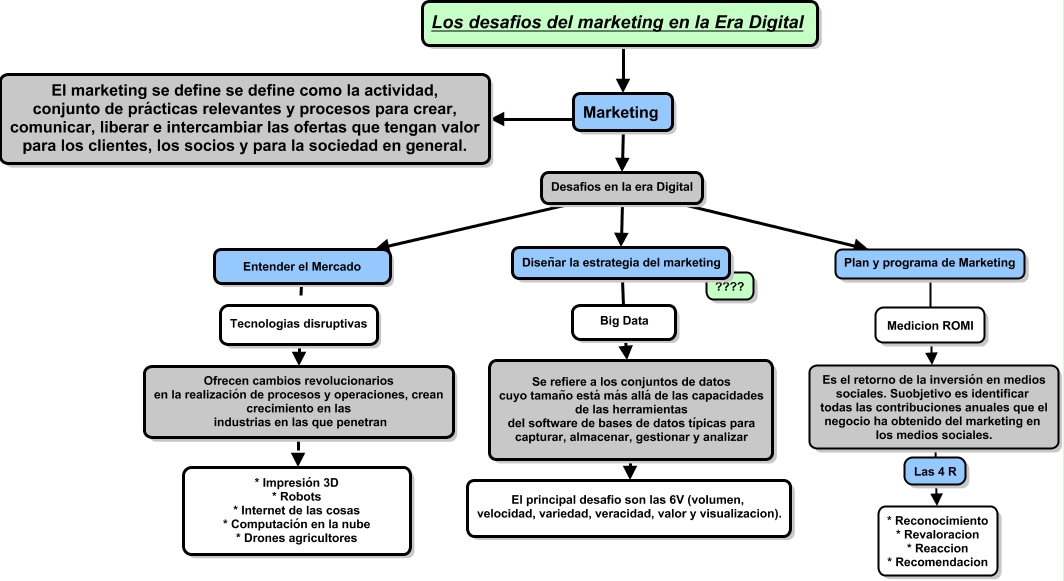Este Cmap, tiene información relacionada con: Ramon 1, Se refiere a los conjuntos de datos cuyo tamaño está más allá de las capacidades de las herramientas del software de bases de datos típicas para capturar, almacenar, gestionar y analizar El principal desafio son las 6V (volumen, velocidad, variedad, veracidad, valor y visualizacion)., Marketing ???? Desafios en la era Digital, Medicion ROMI Es el retorno de la inversión en medios sociales. Suobjetivo es identificar todas las contribuciones anuales que el negocio ha obtenido del marketing en los medios sociales., Desafios en la era Digital ???? Entender el Mercado, Entender el Mercado Tecnologias disruptivas, Desafios en la era Digital ???? Diseñar la estrategia del marketing, Diseñar la estrategia del marketing Big Data, Desafios en la era Digital ???? Plan y programa de Marketing, Es el retorno de la inversión en medios sociales. Suobjetivo es identificar todas las contribuciones anuales que el negocio ha obtenido del marketing en los medios sociales. * Reconocimiento * Revaloracion * Reaccion * Recomendacion, Plan y programa de Marketing Medicion ROMI, Tecnologias disruptivas Ofrecen cambios revolucionarios en la realización de procesos y operaciones, crean crecimiento en las industrias en las que penetran, Big Data Se refiere a los conjuntos de datos cuyo tamaño está más allá de las capacidades de las herramientas del software de bases de datos típicas para capturar, almacenar, gestionar y analizar, Marketing ???? El marketing se define se define como la actividad, conjunto de prácticas relevantes y procesos para crear, comunicar, liberar e intercambiar las ofertas que tengan valor para los clientes, los socios y para la sociedad en general., Los desafios del marketing en la Era Digital ???? Marketing, Ofrecen cambios revolucionarios en la realización de procesos y operaciones, crean crecimiento en las industrias en las que penetran * Impresión 3D * Robots * Internet de las cosas * Computación en la nube * Drones agricultores