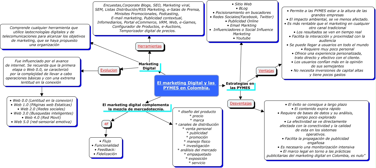 Este Cmap, tiene información relacionada con: Ramon 3, El marketing Digital y las PYMES en Colombia. Marketing Digital Herramientas, Herramientas Encuestas,Corporate Blogs, SEO, Marketing viral, SEM, Listas Distribución/RSS Marketing, e-Salas de Prensa, Minisites Promocionales, Podcasting, E-mail marketing, Publicidad contextual, Infomediarios, Portal eCommerce, VRM, Web, e-Games, Configurador de Productos, e-Auctions, Temporizador digital de precios., Ventajas • Permite a las PYMES estar a la altura de las grandes empresas • El impacto ambiental, se ve menos afectado. • Es más rentable que el marketing en cualquier otro canal tradicional • Los resultados se ven en tiempo real • Facilita la interacción y proximidad con la audiencia • Se puede llegar a usuarios en todo el mundo • Requiere muy poco personal • Ofrece una experiencia personalizada, trato directo y efectivo con el cliente. • Los usuarios confían más en la opinión de sus semejantes • No necesita inversiones de capital altas y tiene pocos gastos, El marketing Digital y las PYMES en Colombia. Estrategias en las PYMES Desventajas, 4F • Flujo • Funcionalidad • Feedback: • Fidelización, El marketing Digital y las PYMES en Colombia. Marketing Digital Comprende cualquier herramienta que utilice lastecnologías digitales y de telecomunicaciones para alcanzar los objetivos de marketing, que se haya propuesto una organización, El marketing Digital y las PYMES en Colombia. Estrategias en las PYMES Ventajas, El marketing Digital y las PYMES en Colombia. Marketing Digital Evolucion, El marketing Digital y las PYMES en Colombia. El marketing digital complementa la mezcla de mercadotecnia. * diseño del producto * precio * marca * canales de distribución * venta personal * publicidad * promoción * manejo físico * investigación * análisis del mercado * empaquetado * exposición * servicio, Fue influenciado por el avance de internet. Se recuerda que la primera etapa o Web 0.0, se caracterizó por la complejidad de llevar a cabo operaciones básicas y con una extrema lentitud en la conexión • Web 0.0 (Lentitud en la conexion) • Web 1.0 (PAginas web Estaticas) • Web 2.0 (Redes sociales) • Web 3.0 (Busquedas inteligentes) • Web 4.0 (Red Movil) • Web 5.0 (red-sensorial emotiva), Evolucion Fue influenciado por el avance de internet. Se recuerda que la primera etapa o Web 0.0, se caracterizó por la complejidad de llevar a cabo operaciones básicas y con una extrema lentitud en la conexión, El marketing Digital y las PYMES en Colombia. El marketing digital complementa la mezcla de mercadotecnia. 4F, Desventajas • El éxito se consigue a largo plazo • El contenido expira rápido • Requiere de bases de datos y su análisis, campo poco explorado • La efectividad se ve directamente afectada con la conectividad y la calidad de esta en los sistemas operativos. • Facilita la propagación de publicidad engañosa • Es necesario una monitorización intensiva • El marco legal en torno a las prácticas publicitarias del marketing digital en Colombia, es nulo”, El marketing Digital y las PYMES en Colombia. Estrategias en las PYMES • Sitio Web • BLog • Pocisionamiento en buscadores • Redes Sociales(Facebook, Twitter) • Publicidad Online • Email Markting • Influenciadores o Social Influence Marketing • Youtube