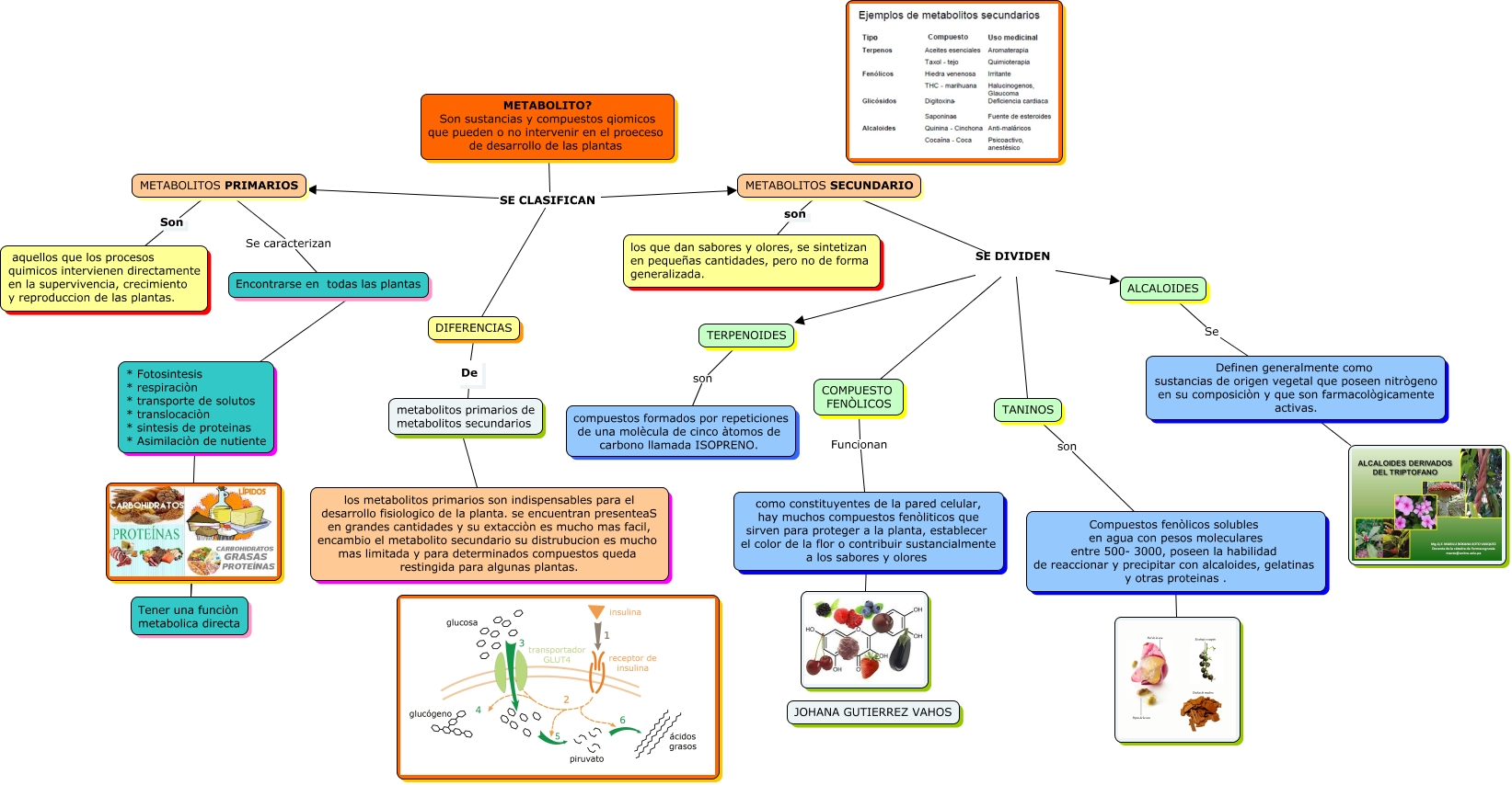 Este Cmap, tiene información relacionada con: Metabolitos primarios y secundarios, METABOLITO? Son sustancias y compuestos qiomicos que pueden o no intervenir en el proeceso de desarrollo de las plantas SE CLASIFICAN METABOLITOS PRIMARIOS, COMPUESTO FENÒLICOS Funcionan como constituyentes de la pared celular, hay muchos compuestos fenòliticos que sirven para proteger a la planta, establecer el color de la flor o contribuir sustancialmente a los sabores y olores, * Fotosintesis * respiraciòn * transporte de solutos * translocaciòn * sintesis de proteinas * Asimilaciòn de nutiente ???? Tener una funciòn metabolica directa, Encontrarse en todas las plantas ???? * Fotosintesis * respiraciòn * transporte de solutos * translocaciòn * sintesis de proteinas * Asimilaciòn de nutiente, METABOLITOS PRIMARIOS Se caracterizan Encontrarse en todas las plantas, METABOLITOS SECUNDARIO SE DIVIDEN COMPUESTO FENÒLICOS, como constituyentes de la pared celular, hay muchos compuestos fenòliticos que sirven para proteger a la planta, establecer el color de la flor o contribuir sustancialmente a los sabores y olores ????, METABOLITO? Son sustancias y compuestos qiomicos que pueden o no intervenir en el proeceso de desarrollo de las plantas SE CLASIFICAN DIFERENCIAS, Compuestos fenòlicos solubles en agua con pesos moleculares entre 500- 3000, poseen la habilidad de reaccionar y precipitar con alcaloides, gelatinas y otras proteinas . ????, METABOLITO? Son sustancias y compuestos qiomicos que pueden o no intervenir en el proeceso de desarrollo de las plantas SE CLASIFICAN METABOLITOS SECUNDARIO, ALCALOIDES Se Definen generalmente como sustancias de origen vegetal que poseen nitrògeno en su composiciòn y que son farmacològicamente activas., METABOLITOS SECUNDARIO SE DIVIDEN TERPENOIDES, DIFERENCIAS De metabolitos primarios de metabolitos secundarios, METABOLITOS SECUNDARIO SE DIVIDEN ALCALOIDES, TERPENOIDES son compuestos formados por repeticiones de una molècula de cinco àtomos de carbono llamada ISOPRENO., TANINOS son Compuestos fenòlicos solubles en agua con pesos moleculares entre 500- 3000, poseen la habilidad de reaccionar y precipitar con alcaloides, gelatinas y otras proteinas ., METABOLITOS SECUNDARIO son los que dan sabores y olores, se sintetizan en pequeñas cantidades, pero no de forma generalizada., METABOLITOS PRIMARIOS Son aquellos que los procesos quimicos intervienen directamente en la supervivencia, crecimiento y reproduccion de las plantas., metabolitos primarios de metabolitos secundarios ???? los metabolitos primarios son indispensables para el desarrollo fisiologico de la planta. se encuentran presenteaS en grandes cantidades y su extacciòn es mucho mas facil, encambio el metabolito secundario su distrubucion es mucho mas limitada y para determinados compuestos queda restingida para algunas plantas., Definen generalmente como sustancias de origen vegetal que poseen nitrògeno en su composiciòn y que son farmacològicamente activas. ????