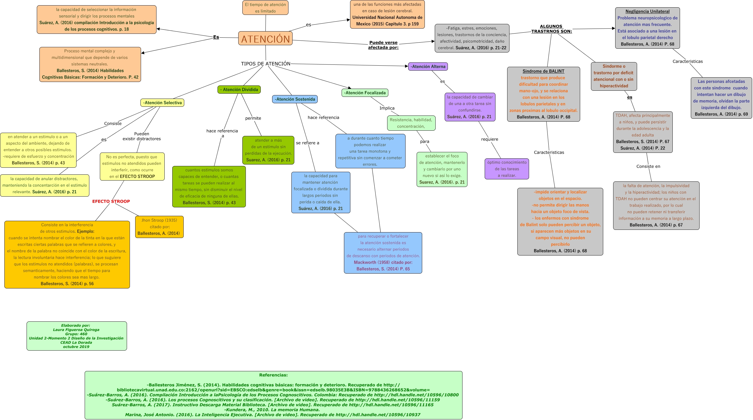 Este Cmap, tiene información relacionada con: Proceso de la Atención, -Atención Selectiva es la capacidad de anular distractores, manteniendo la concentarción en el estimulo relevante. Suárez, A. (2016) p. 21, TDAH, afecta principalmente a niños, y puede persistir durante la adolescencia y la edad adulta Ballesteros, S. (2014) P. 67 Suárez, A. (2014) P. 22 Consiste en la falta de atención, la impulsividad y la hiperactividad; los niños con TDAH no pueden centrar su atención en el trabajo realizado, por lo cual no pueden retener ni transferir información a su memoria a largo plazo. Ballesteros, A. (2014) p. 67, Sindrome de BALINT trastorno que produce dificultad para coordinar mano-ojo, y se relaciona con una lesión en los lobulos parietales y en zonas proximas al lobulo occipital. Ballesteros, A. (2014) P. 68 Caracteristicas -impide orientar y localizar objetos en el espacio. -no permite dirigir las manos hacia un objeto foco de vista. - los enfermos con sindrome de Balint solo pueden percibir un objeto, si aparecen más objetos en su campo visual, no pueden percibirlo Ballesteros, A. (2014) p. 68, -Atención Sostenida se refiere a la capacidad para mantener atención focalizada o dividida durante largos periodos sin perida o caida de ella. Suárez, A. (2016) p. 21, No es perfecta, puesto que estimulos no atendidos pueden interferir, como ocurre en el EFECTO STROOP EFECTO STROOP Consiste en la interferencia de otros estimulos. Ejemplo: cuando se intenta nombrar el color de la tinta en la que están escritas ciertas palabras que se refieren a colores, y el nombre de la palabra no coincide con el color de la escritura, la lectura involuntaria hace interferencia; lo que suguiere que los estimulos no atendidos (palabras), se procesan semanticamente, haciendo que el tiempo para nombrar los colores sea mas largo. Ballesteros, S. (2014) p. 56, ATENCIÓN TIPOS DE ATENCIÓN -Atención Selectiva, No es perfecta, puesto que estimulos no atendidos pueden interferir, como ocurre en el EFECTO STROOP EFECTO STROOP Jhon Stroop (1935) citado por: Ballesteros, A. (2014), ATENCIÓN Es la capacidad de seleccionar la información sensorial y dirigir los procesos mentales Suárez, A. (2016) compilación Introducción a la psicología de los procesos cognitivos. p. 18, -Fatiga, estres, emociones, lesiones, trastornos de la conciencia, afectividad, psicomotricidad, daño cerebral. Suárez, A. (2016) p. 21-22 ALGUNOS TRASTRNOS SON: Sindorme o trastorno por deficit atencional con o sin hiperactividad, -Atención Alterna es la capacidad de cambiar de una a otra tarea sin confundirse. Suárez, A. (2016) p. 21, la capacidad de cambiar de una a otra tarea sin confundirse. Suárez, A. (2016) p. 21 requiere óptimo conocimiento de las tareas a realizar., ATENCIÓN TIPOS DE ATENCIÓN -Atención Focalizada, Sindorme o trastorno por deficit atencional con o sin hiperactividad es TDAH, afecta principalmente a niños, y puede persistir durante la adolescencia y la edad adulta Ballesteros, S. (2014) P. 67 Suárez, A. (2014) P. 22, - Atención Dividida permite atender a más de un estimulo sin perdidas de la ejecución. Suarez, A. (2016) p. 21, ATENCIÓN TIPOS DE ATENCIÓN - Atención Dividida, ATENCIÓN es una de las funciones más afectadas en caso de lesión cerebral. Universidad Nacional Autonoma de Mexico (2015) Capitulo 3. p 159, Resistencia, habilidad, concentración, para establecer el foco de atención, mantenerlo y cambiarlo por uno nuevo si así lo exige. Suarez, A. (2016). p. 21, a durante cuanto tiempo podemos realizar una tarea monotona y repetitiva sin comenzar a cometer errores. ???? para recuperar o fortalecer la atención sostenida es necesario alternar periodos de descanso con periodos de atención. Mackworth (1958) citado por: Ballesteros, S. (2014) P. 65, -Atención Focalizada Implica Resistencia, habilidad, concentración,, ATENCIÓN TIPOS DE ATENCIÓN -Atención Alterna