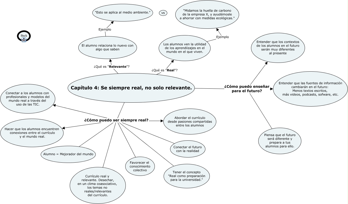 Este Cmap, tiene información relacionada con: Capítulo 4_Prensky, Los alumnos ven la utilidad de los aprendiizajes en el mundo en el que viven. Ejemplo "Midamos la huella de carbono de la empresa X, y ayudémosle a ahorrar con medidas ecológicas.", Capítulo 4: Se siempre real, no solo relevante. ¿Cómo puedo ser siempre real? Conectar el futuro con la realidad, Capítulo 4: Se siempre real, no solo relevante. ¿Cómo puedo ser siempre real? Favorecer el conocimiento colectivo, Capítulo 4: Se siempre real, no solo relevante. ¿Qué es "Real"? Los alumnos ven la utilidad de los aprendiizajes en el mundo en el que viven., Capítulo 4: Se siempre real, no solo relevante. ¿Cómo puedo enseñar para el futuro? Piensa que el futuro será diferente y prepara a tus alumnos para ello., Capítulo 4: Se siempre real, no solo relevante. ¿Cómo puedo ser siempre real? Alumno = Mejorador del mundo, Capítulo 4: Se siempre real, no solo relevante. ¿Cómo puedo ser siempre real? Tener el concepto "Real como preparación para la universidad.", Capítulo 4: Se siempre real, no solo relevante. ¿Cómo puedo enseñar para el futuro? Entender que los contextos de los alumnos en el futuro serán muy diferentes al presente, Capítulo 4: Se siempre real, no solo relevante. ¿Cómo puedo enseñar para el futuro? Entender que las fuentes de información cambiarán en el futuro: Menos textos escritos, más videos, podcasts, sofware, etc., El alumno relaciona lo nuevo con algo que saben Ejemplo "Esto se aplica al medio ambiente.", Capítulo 4: Se siempre real, no solo relevante. ¿Cómo puedo ser siempre real? Hacer que los alumnos encuentren conexiones entre el currículo y el mundo real., Capítulo 4: Se siempre real, no solo relevante. ¿Cómo puedo ser siempre real? Conectar a los alumnos con profesionales y modelos del mundo real a través del uso de las TIC., Capítulo 4: Se siempre real, no solo relevante. ¿Cómo puedo ser siempre real? Currículo real y relevante. Desechar, en un clima coasociativo, los temas no reales/relevantes del currículo., Capítulo 4: Se siempre real, no solo relevante. ¿Cómo puedo ser siempre real? Abordar el currículo desde pasiones compartidas entre los alumnos, Capítulo 4: Se siempre real, no solo relevante. ¿Qué es "Relevante"? El alumno relaciona lo nuevo con algo que saben