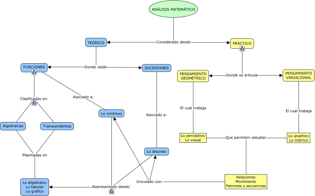 Este Cmap, tiene información relacionada con: Análisis matemático, Lo perceptivo Lo visual Que permiten estudiar Relaciones Movimiento Patrones y secuencias, PRÁCTICO Donde se articula PENSAMIENTO GEOMÉTRICO, FUNCIONES Clasificadas en: Algebraicas, SUCESIONES Asociado a: Lo discreto, PRÁCTICO Donde se articula PENSAMIENTO VARIACIONAL, FUNCIONES Clasificadas en: Transcendentes, Algebraicas Plasmadas en Lo algebraico Lo tabular Lo gráfico, FUNCIONES Asociado a: Lo continuo, TEÓRICO Donde están FUNCIONES, Relaciones Movimiento Patrones y secuencias Vinculado con: Lo discreto, Transcendentes Plasmadas en Lo algebraico Lo tabular Lo gráfico, ANÁLISIS MATEMÁTICO Considerado desde PRÁCTICO, Lo continuo Representado desde: Lo algebraico Lo tabular Lo gráfico, ANÁLISIS MATEMÁTICO Considerado desde TEÓRICO, PENSAMIENTO GEOMÉTRICO El cual trabaja Lo perceptivo Lo visual, Lo discreto Representado desde: Lo algebraico Lo tabular Lo gráfico, PENSAMIENTO VARIACIONAL El cual trabaja Lo analítico Lo métrico, TEÓRICO Donde están SUCESIONES, Relaciones Movimiento Patrones y secuencias Vinculado con: Lo continuo, Lo analítico Lo métrico Que permiten estudiar Relaciones Movimiento Patrones y secuencias