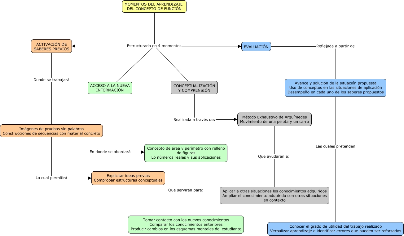 Este Cmap, tiene información relacionada con: Ruta funciones, Avance y solución de la situación propuesta Uso de conceptos en las situaciones de aplicación Desempeño en cada uno de los saberes propuestos Las cuales pretenden Conocer el grado de utilidad del trabajo realizado Verbalizar aprendizaje e identificar errores que pueden ser reforzados, Concepto de área y perímetro con relleno de figuras Lo números reales y sus aplicaciones Que servirán para: Tomar contacto con los nuevos conocimientos Comparar los conocimientos anteriores Producir cambios en los esquemas mentales del estudiante, ACCESO A LA NUEVA INFORMACIÓN En donde se abordará Concepto de área y perímetro con relleno de figuras Lo números reales y sus aplicaciones, Método Exhaustivo de Arquímedes Movimiento de una pelota y un carro Que ayudarán a: Aplicar a otras situaciones los conocimientos adquiridos Ampliar el conocimiento adquirido con otras situaciones en contexto, EVALUACIÓN Reflejada a partir de Avance y solución de la situación propuesta Uso de conceptos en las situaciones de aplicación Desempeño en cada uno de los saberes propuestos, MOMENTOS DEL APRENDIZAJE DEL CONCEPTO DE FUNCIÓN Estructurado en 4 momentos ACTIVACIÓN DE SABERES PREVIOS, ACTIVACIÓN DE SABERES PREVIOS Donde se trabajará Imágenes de pruebas sin palabras Construcciones de secuencias con material concreto, Imágenes de pruebas sin palabras Construcciones de secuencias con material concreto Lo cual permitirá Explicitar ideas previas Comprobar estructuras conceptuales, MOMENTOS DEL APRENDIZAJE DEL CONCEPTO DE FUNCIÓN Estructurado en 4 momentos CONCEPTUALIZACIÓN Y COMPRENSIÓN, MOMENTOS DEL APRENDIZAJE DEL CONCEPTO DE FUNCIÓN Estructurado en 4 momentos ACCESO A LA NUEVA INFORMACIÓN, MOMENTOS DEL APRENDIZAJE DEL CONCEPTO DE FUNCIÓN Estructurado en 4 momentos EVALUACIÓN, CONCEPTUALIZACIÓN Y COMPRENSIÓN Realizada a través de: Método Exhaustivo de Arquímedes Movimiento de una pelota y un carro