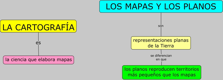 Este Cmap, tiene información relacionada con: La cartografía, los planos y los mapas, representaciones planas de la Tierra se diferencian en que los planos reproducen territorios más pequeños que los mapas, LA CARTOGRAFÍA es la ciencia que elabora mapas, LOS MAPAS Y LOS PLANOS son representaciones planas de la Tierra