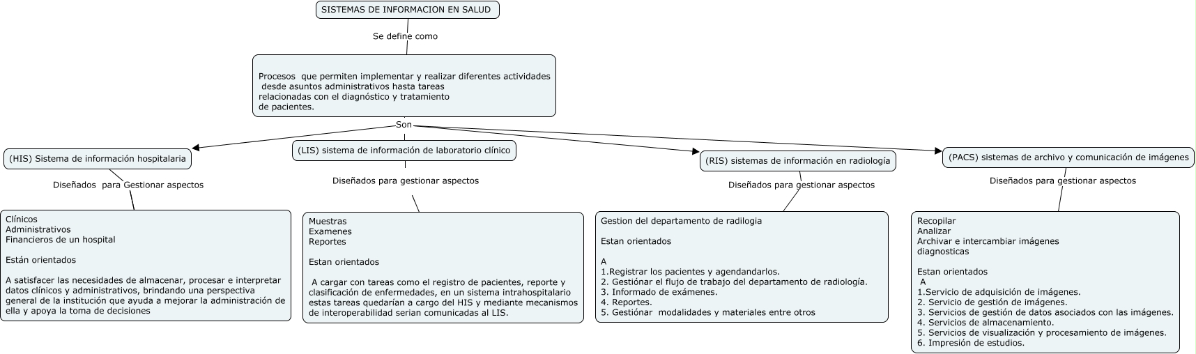 Este Cmap, tiene información relacionada con: SISTEMAS DE INFORMACION EN SALUD, Procesos que permiten implementar y realizar diferentes actividades desde asuntos administrativos hasta tareas relacionadas con el diagnóstico y tratamiento de pacientes. Son (RIS) sistemas de información en radiología, (RIS) sistemas de información en radiología Diseñados para gestionar aspectos Gestion del departamento de radilogia Estan orientados A 1.Registrar los pacientes y agendandarlos. 2. Gestiónar el flujo de trabajo del departamento de radiología. 3. Informado de exámenes. 4. Reportes. 5. Gestiónar modalidades y materiales entre otros, SISTEMAS DE INFORMACION EN SALUD Se define como Procesos que permiten implementar y realizar diferentes actividades desde asuntos administrativos hasta tareas relacionadas con el diagnóstico y tratamiento de pacientes., Procesos que permiten implementar y realizar diferentes actividades desde asuntos administrativos hasta tareas relacionadas con el diagnóstico y tratamiento de pacientes. Son (LIS) sistema de información de laboratorio clínico, (LIS) sistema de información de laboratorio clínico Diseñados para gestionar aspectos Muestras Examenes Reportes Estan orientados A cargar con tareas como el registro de pacientes, reporte y clasificación de enfermedades, en un sistema intrahospitalario estas tareas quedarían a cargo del HIS y mediante mecanismos de interoperabilidad serian comunicadas al LIS., (PACS) sistemas de archivo y comunicación de imágenes Diseñados para gestionar aspectos Recopilar Analizar Archivar e intercambiar imágenes diagnosticas Estan orientados A 1.Servicio de adquisición de imágenes. 2. Servicio de gestión de imágenes. 3. Servicios de gestión de datos asociados con las imágenes. 4. Servicios de almacenamiento. 5. Servicios de visualización y procesamiento de imágenes. 6. Impresión de estudios., Procesos que permiten implementar y realizar diferentes actividades desde asuntos administrativos hasta tareas relacionadas con el diagnóstico y tratamiento de pacientes. Son (PACS) sistemas de archivo y comunicación de imágenes, (HIS) Sistema de información hospitalaria Diseñados para Gestionar aspectos Clínicos Administrativos Financieros de un hospital Están orientados A satisfacer las necesidades de almacenar, procesar e interpretar datos clínicos y administrativos, brindando una perspectiva general de la institución que ayuda a mejorar la administración de ella y apoya la toma de decisiones, Procesos que permiten implementar y realizar diferentes actividades desde asuntos administrativos hasta tareas relacionadas con el diagnóstico y tratamiento de pacientes. Son (HIS) Sistema de información hospitalaria, (HIS) Sistema de información hospitalaria Diseñados para Gestionar aspectos Clínicos Administrativos Financieros de un hospital Están orientados A satisfacer las necesidades de almacenar, procesar e interpretar datos clínicos y administrativos, brindando una perspectiva general de la institución que ayuda a mejorar la administración de ella y apoya la toma de decisiones