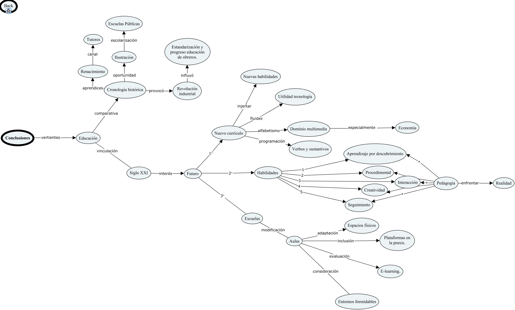 Este Cmap, tiene información relacionada con: Conclusiones, Siglo XXI interés Futuro, Escuelas modificación Aulas, Conclusiones vertientes Educación, Ilustración escolarización Escuelas Públicas, Nuevo currículo programación Verbos y sustantivos, Nuevo currículo injertar Nuevas habilidades, Aulas evaluación E-learning., Habilidades 3 Interacción, Aulas inclusión Plataformas en la praxis., Pedagogía enfrentar Realidad, Educación comparativa Cronología histórica, Pedagogía * Creatividad, Futuro 3° Escuelas, Dominio multimedia especialmente Economía, Habilidades 1 Aprendizaje por descubrimiento, Educación vinculación Siglo XXI, Nuevo currículo alfabetismo Dominio multimedia, Habilidades 2 Procedimental, Pedagogía * Procedimental, Cronología histórica aprendices Renacimiento