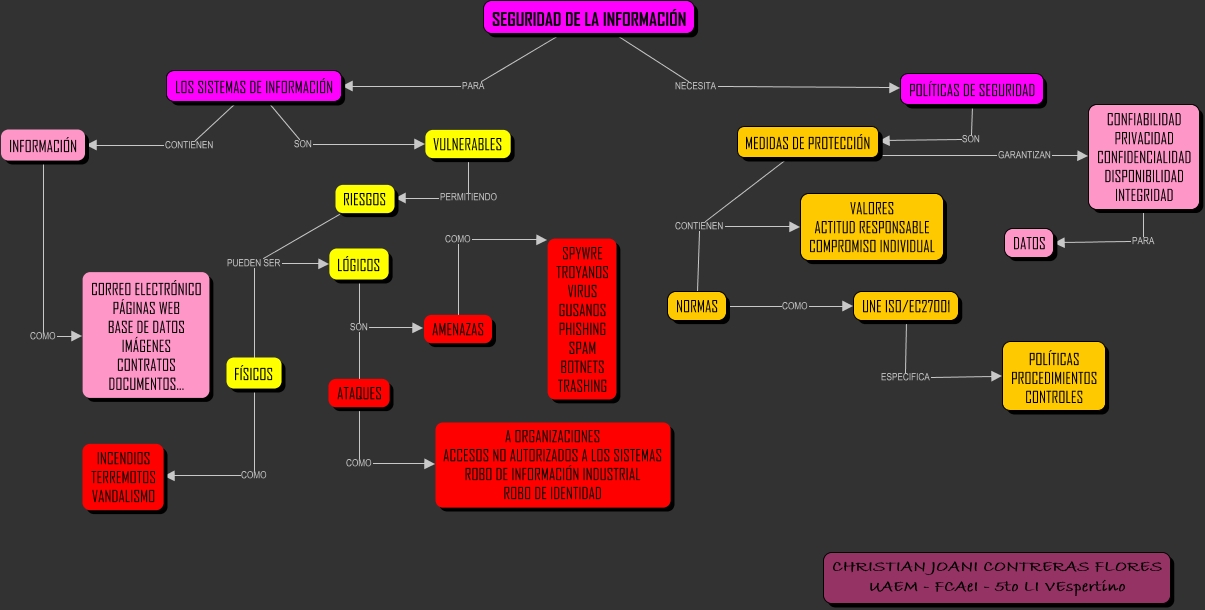 Este Cmap, tiene información relacionada con: MAPA CONCEPTUAL, ATAQUES COMO A ORGANIZACIONES ACCESOS NO AUTORIZADOS A LOS SISTEMAS ROBO DE INFORMACIÓN INDUSTRIAL ROBO DE IDENTIDAD, LÓGICOS SON ATAQUES, CONFIABILIDAD PRIVACIDAD CONFIDENCIALIDAD DISPONIBILIDAD INTEGRIDAD PARA DATOS, POLÍTICAS DE SEGURIDAD SON MEDIDAS DE PROTECCIÓN, MEDIDAS DE PROTECCIÓN CONTIENEN NORMAS, RIESGOS PUEDEN SER FÍSICOS, MEDIDAS DE PROTECCIÓN CONTIENEN VALORES ACTITUD RESPONSABLE COMPROMISO INDIVIDUAL, SEGURIDAD DE LA INFORMACIÓN PARA LOS SISTEMAS DE INFORMACIÓN, LOS SISTEMAS DE INFORMACIÓN CONTIENEN INFORMACIÓN, NORMAS COMO UNE ISO/EC27001, AMENAZAS COMO SPYWRE TROYANOS VIRUS GUSANOS PHISHING SPAM BOTNETS TRASHING, INFORMACIÓN COMO CORREO ELECTRÓNICO PÁGINAS WEB BASE DE DATOS IMÁGENES CONTRATOS DOCUMENTOS..., VULNERABLES PERMITIENDO RIESGOS, LOS SISTEMAS DE INFORMACIÓN SON VULNERABLES, FÍSICOS COMO INCENDIOS TERREMOTOS VANDALISMO, SEGURIDAD DE LA INFORMACIÓN NECESITA POLÍTICAS DE SEGURIDAD, RIESGOS PUEDEN SER LÓGICOS, MEDIDAS DE PROTECCIÓN GARANTIZAN CONFIABILIDAD PRIVACIDAD CONFIDENCIALIDAD DISPONIBILIDAD INTEGRIDAD, LÓGICOS SON AMENAZAS, UNE ISO/EC27001 ESPECIFICA POLÍTICAS PROCEDIMIENTOS CONTROLES