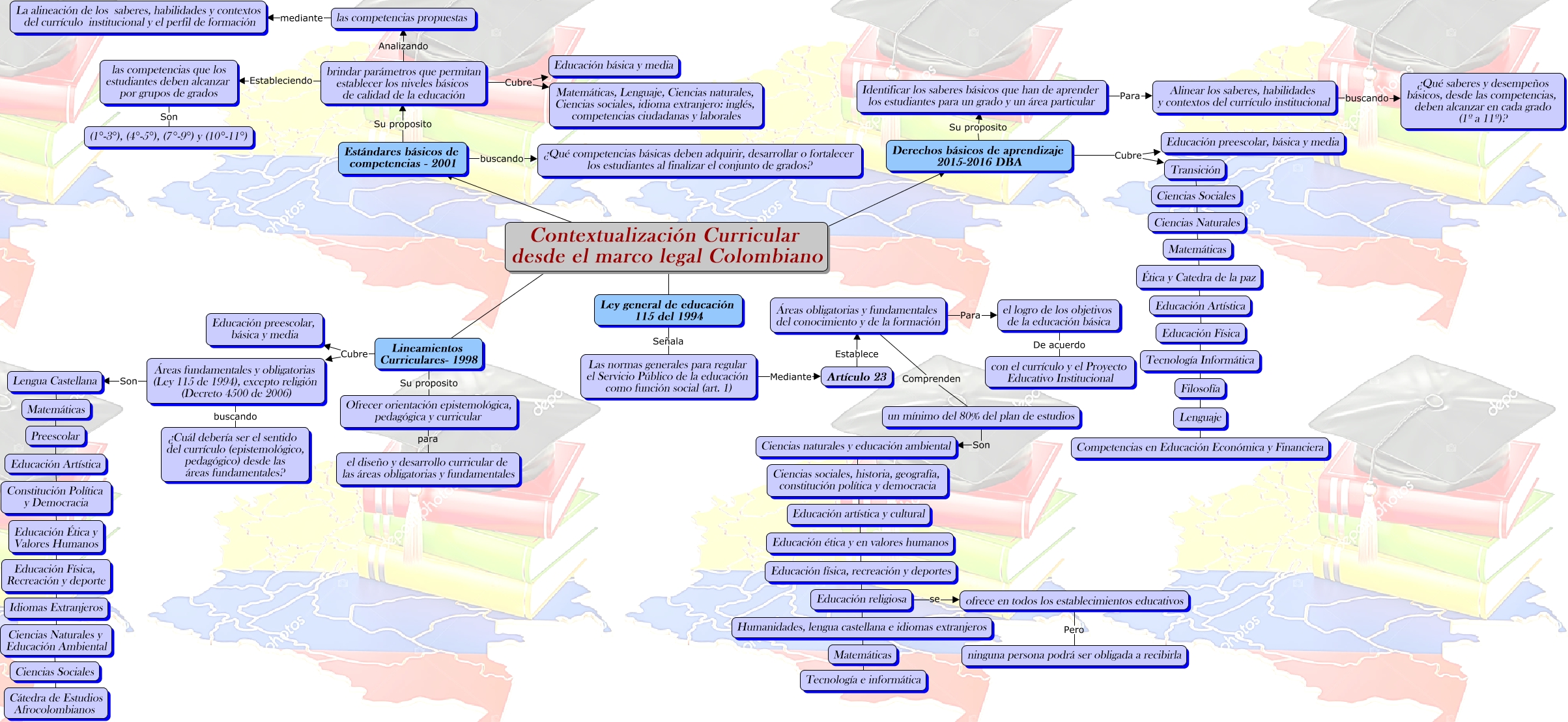 Este Cmap, tiene información relacionada con: Contextualización Curricular desde el marco legal Colombiano, Contextualización Curricular desde el marco legal Colombiano ???? Estándares básicos de competencias - 2001, brindar parámetros que permitan establecer los niveles básicos de calidad de la educación Analizando las competencias propuestas, Lineamientos Curriculares- 1998 Su proposito Ofrecer orientación epistemológica, pedagógica y curricular, Matemáticas ???? Ética y Catedra de la paz, brindar parámetros que permitan establecer los niveles básicos de calidad de la educación Cubre Educación básica y media, Matemáticas ???? Preescolar, Áreas fundamentales y obligatorias (Ley 115 de 1994), excepto religión (Decreto 4500 de 2006) Son Lengua Castellana, las competencias que los estudiantes deben alcanzar por grupos de grados Son (1°-3°), (4°-5°), (7°-9°) y (10°-11°), Identificar los saberes básicos que han de aprender los estudiantes para un grado y un área particular Para Alinear los saberes, habilidades y contextos del currículo institucional, Educación Artística ???? Educación Física, Ciencias naturales y educación ambiental ???? Ciencias sociales, historia, geografía, constitución política y democracia, Áreas obligatorias y fundamentales del conocimiento y de la formación Comprenden un mínimo del 80% del plan de estudios, Matemáticas ???? Tecnología e informática, Educación física, recreación y deportes ???? Educación religiosa, Lenguaje ???? Competencias en Educación Económica y Financiera, Educación ética y en valores humanos ???? Educación física, recreación y deportes, Ley general de educación 115 del 1994 Señala Las normas generales para regular el Servicio Público de la educación como función social (art. 1), brindar parámetros que permitan establecer los niveles básicos de calidad de la educación Estableciendo las competencias que los estudiantes deben alcanzar por grupos de grados, Lineamientos Curriculares- 1998 Cubre Áreas fundamentales y obligatorias (Ley 115 de 1994), excepto religión (Decreto 4500 de 2006), Derechos básicos de aprendizaje 2015-2016 DBA Cubre Educación preescolar, básica y media