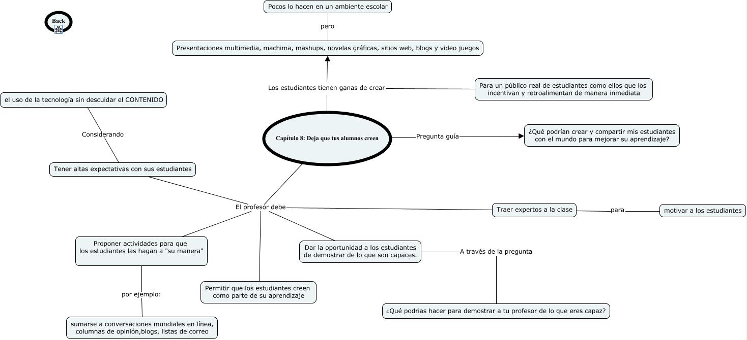 Este Cmap, tiene información relacionada con: Capítulo 8, Dar la oportunidad a los estudiantes de demostrar de lo que son capaces. A través de la pregunta ¿Qué podrias hacer para demostrar a tu profesor de lo que eres capaz?, Capítulo 8: Deja que tus alumnos creen El profesor debe Traer expertos a la clase, Traer expertos a la clase para motivar a los estudiantes, Capítulo 8: Deja que tus alumnos creen El profesor debe Permitir que los estudiantes creen como parte de su aprendizaje, Capítulo 8: Deja que tus alumnos creen El profesor debe Dar la oportunidad a los estudiantes de demostrar de lo que son capaces., Presentaciones multimedia, machima, mashups, novelas gráficas, sitios web, blogs y video juegos pero Pocos lo hacen en un ambiente escolar, Capítulo 8: Deja que tus alumnos creen Los estudiantes tienen ganas de crear Para un público real de estudiantes como ellos que los incentivan y retroalimentan de manera inmediata, Capítulo 8: Deja que tus alumnos creen El profesor debe Proponer actividades para que los estudiantes las hagan a "su manera", Proponer actividades para que los estudiantes las hagan a "su manera" por ejemplo: sumarse a conversaciones mundiales en línea, columnas de opinión,blogs, listas de correo, Capítulo 8: Deja que tus alumnos creen Pregunta guía ¿Qué podrían crear y compartir mis estudiantes con el mundo para mejorar su aprendizaje?, Capítulo 8: Deja que tus alumnos creen Los estudiantes tienen ganas de crear Presentaciones multimedia, machima, mashups, novelas gráficas, sitios web, blogs y video juegos, Tener altas expectativas con sus estudiantes Considerando el uso de la tecnología sin descuidar el CONTENIDO, Capítulo 8: Deja que tus alumnos creen El profesor debe Tener altas expectativas con sus estudiantes
