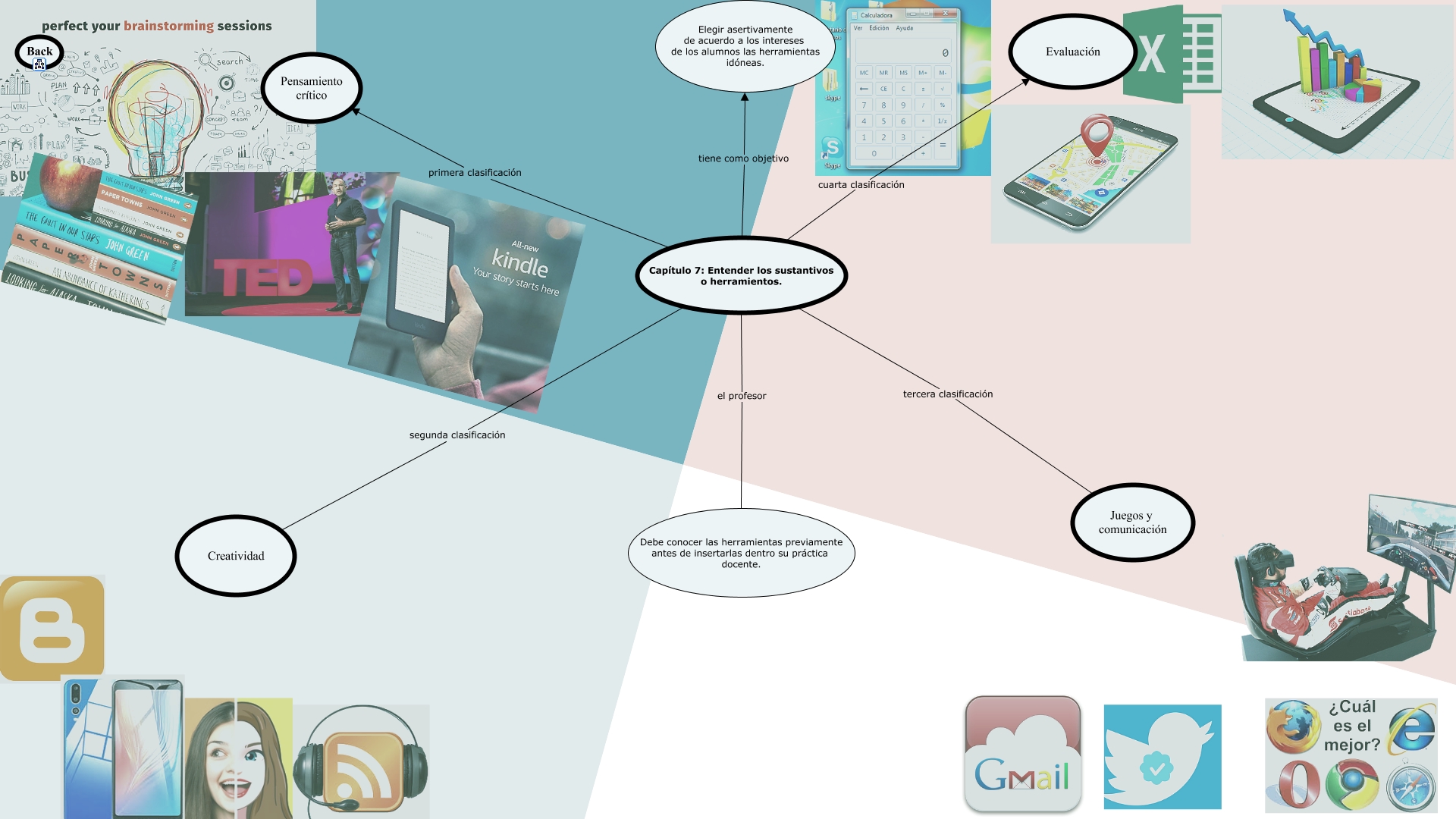 Este Cmap, tiene información relacionada con: Capitulo 7, Capítulo 7: Entender los sustantivos o herramientos. tercera clasificación Juegos y comunicación, Capítulo 7: Entender los sustantivos o herramientos. primera clasificación Pensamiento crítico, Capítulo 7: Entender los sustantivos o herramientos. segunda clasificación Creatividad, Capítulo 7: Entender los sustantivos o herramientos. el profesor Debe conocer las herramientas previamente antes de insertarlas dentro su práctica docente., Capítulo 7: Entender los sustantivos o herramientos. tiene como objetivo Elegir asertivamente de acuerdo a los intereses de los alumnos las herramientas idóneas., Capítulo 7: Entender los sustantivos o herramientos. cuarta clasificación Evaluación