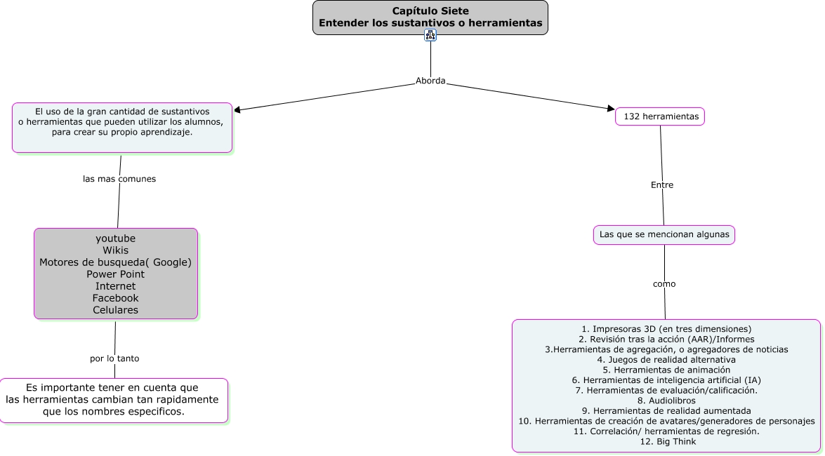Este Cmap, tiene información relacionada con: Capítulo 7, El uso de la gran cantidad de sustantivos o herramientas que pueden utilizar los alumnos, para crear su propio aprendizaje. las mas comunes youtube Wikis Motores de busqueda( Google) Power Point Internet Facebook Celulares, Capítulo Siete Entender los sustantivos o herramientas Aborda 132 herramientas, Capítulo Siete Entender los sustantivos o herramientas Aborda El uso de la gran cantidad de sustantivos o herramientas que pueden utilizar los alumnos, para crear su propio aprendizaje., 132 herramientas Entre Las que se mencionan algunas, Las que se mencionan algunas como 1. Impresoras 3D (en tres dimensiones) 2. Revisión tras la acción (AAR)/Informes 3.Herramientas de agregación, o agregadores de noticias 4. Juegos de realidad alternativa 5. Herramientas de animación 6. Herramientas de inteligencia artificial (IA) 7. Herramientas de evaluación/calificación. 8. Audiolibros 9. Herramientas de realidad aumentada 10. Herramientas de creación de avatares/generadores de personajes 11. Correlación/ herramientas de regresión. 12. Big Think, youtube Wikis Motores de busqueda( Google) Power Point Internet Facebook Celulares por lo tanto Es importante tener en cuenta que las herramientas cambian tan rapidamente que los nombres especificos.