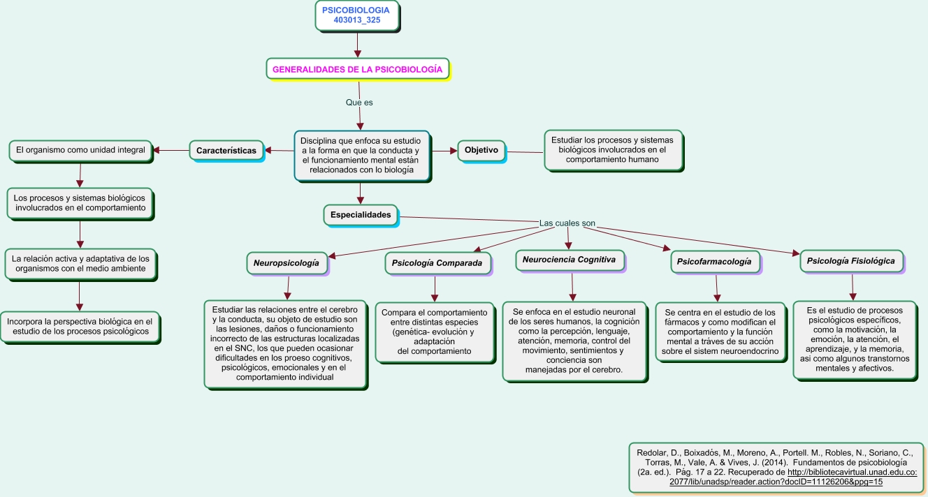 Este Cmap, tiene información relacionada con: GENERALIDADES DE LA PSICOBIOLOGÍA, Psicología Comparada ???? Compara el comportamiento entre distintas especies (genética- evolución y adaptación del comportamiento, Especialidades Las cuales son Psicología Comparada, Neurociencia Cognitiva ???? Se enfoca en el estudio neuronal de los seres humanos, la cognición como la percepción, lenguaje, atención, memoria, control del movimiento, sentimientos y conciencia son manejadas por el cerebro., Psicología Fisiológica ???? Es el estudio de procesos psicológicos específicos, como la motivación, la emoción, la atención, el aprendizaje, y la memoria, asi como algunos transtornos mentales y afectivos., Especialidades Las cuales son Neurociencia Cognitiva, Objetivo ???? Estudiar los procesos y sistemas biológicos involucrados en el comportamiento humano, PSICOBIOLOGIA 403013_325 ???? GENERALIDADES DE LA PSICOBIOLOGÍA, Psicofarmacología ???? Se centra en el estudio de los fármacos y como modifican el comportamiento y la función mental a tráves de su acción sobre el sistem neuroendocrino, Neuropsicología ???? Estudiar las relaciones entre el cerebro y la conducta, su objeto de estudio son las lesiones, daños o funcionamiento incorrecto de las estructuras localizadas en el SNC, los que pueden ocasionar dificultades en los proeso cognitivos, psicológicos, emocionales y en el comportamiento individual, Disciplina que enfoca su estudio a la forma en que la conducta y el funcionamiento mental están relacionados con lo biología ???? Especialidades, Especialidades Las cuales son Psicofarmacología, La relación activa y adaptativa de los organismos con el medio ambiente ???? Incorpora la perspectiva biológica en el estudio de los procesos psicológicos, Los procesos y sistemas biológicos involucrados en el comportamiento ???? La relación activa y adaptativa de los organismos con el medio ambiente, Especialidades Las cuales son Psicología Fisiológica, Disciplina que enfoca su estudio a la forma en que la conducta y el funcionamiento mental están relacionados con lo biología ???? Características, Características ???? El organismo como unidad integral, GENERALIDADES DE LA PSICOBIOLOGÍA Que es Disciplina que enfoca su estudio a la forma en que la conducta y el funcionamiento mental están relacionados con lo biología, El organismo como unidad integral ???? Los procesos y sistemas biológicos involucrados en el comportamiento, Especialidades Las cuales son Neuropsicología, Disciplina que enfoca su estudio a la forma en que la conducta y el funcionamiento mental están relacionados con lo biología ???? Objetivo