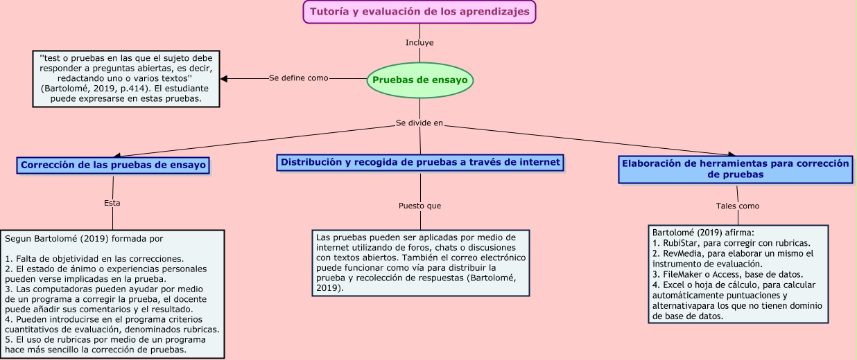 Este Cmap, tiene información relacionada con: Mapa Conceptual de Pruebas de ensayo, Tutoría y evaluación de los aprendizajes Incluye Pruebas de ensayo, Corrección de las pruebas de ensayo Esta Segun Bartolomé (2019) formada por 1. Falta de objetividad en las correcciones. 2. El estado de ánimo o experiencias personales pueden verse implicadas en la prueba. 3. Las computadoras pueden ayudar por medio de un programa a corregir la prueba, el docente puede añadir sus comentarios y el resultado. 4. Pueden introducirse en el programa criterios cuantitativos de evaluación, denominados rubricas. 5. El uso de rubricas por medio de un programa hace más sencillo la corrección de pruebas., Pruebas de ensayo Se define como ''test o pruebas en las que el sujeto debe responder a preguntas abiertas, es decir, redactando uno o varios textos'' (Bartolomé, 2019, p.414). El estudiante puede expresarse en estas pruebas., Pruebas de ensayo Se divide en Distribución y recogida de pruebas a través de internet, Distribución y recogida de pruebas a través de internet Puesto que Las pruebas pueden ser aplicadas por medio de internet utilizando de foros, chats o discusiones con textos abiertos. También el correo electrónico puede funcionar como vía para distribuir la prueba y recolección de respuestas (Bartolomé, 2019)., Elaboración de herramientas para corrección de pruebas Tales como Bartolomé (2019) afirma: 1. RubiStar, para corregir con rubricas. 2. RevMedia, para elaborar un mismo el instrumento de evaluación. 3. FileMaker o Access, base de datos. 4. Excel o hoja de cálculo, para calcular automáticamente puntuaciones y alternativapara los que no tienen dominio de base de datos., Pruebas de ensayo Se divide en Corrección de las pruebas de ensayo, Pruebas de ensayo Se divide en Elaboración de herramientas para corrección de pruebas