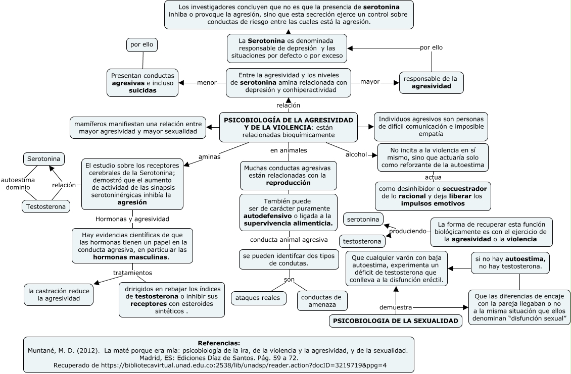 Este Cmap, tiene información relacionada con: psicobiologia de la agresividad y la violencia, PSICOBIOLOGÍA DE LA AGRESIVIDAD Y DE LA VIOLENCIA: están relacionadas bioquímicamente aminas El estudio sobre los receptores cerebrales de la Serotonina; demostró que el aumento de actividad de las sinapsis serotoninérgicas inhibía la agresión, No incita a la violencia en sí mismo, sino que actuaría solo como reforzante de la autoestima actua como desinhibidor o secuestrador de lo racional y deja liberar los impulsos emotivos, La forma de recuperar esta función biológicamente es con el ejercicio de la agresividad o la violencia produciendo serotonina, si no hay autoestima, no hay testosterona. ???? Que las diferencias de encaje con la pareja llegaban o no a la misma situación que ellos denominan “disfunción sexual”, El estudio sobre los receptores cerebrales de la Serotonina; demostró que el aumento de actividad de las sinapsis serotoninérgicas inhibía la agresión relación Testosterona, El estudio sobre los receptores cerebrales de la Serotonina; demostró que el aumento de actividad de las sinapsis serotoninérgicas inhibía la agresión relación Serotonina, si no hay autoestima, no hay testosterona. ???? Que cualquier varón con baja autoestima, experimenta un déficit de testosterona que conlleva a la disfunción eréctil., La forma de recuperar esta función biológicamente es con el ejercicio de la agresividad o la violencia produciendo testosterona, El estudio sobre los receptores cerebrales de la Serotonina; demostró que el aumento de actividad de las sinapsis serotoninérgicas inhibía la agresión Hormonas y agresividad Hay evidencias científicas de que las hormonas tienen un papel en la conducta agresiva, en particular las hormonas masculinas., responsable de la agresividad por ello La Serotonina es denominada responsable de depresión y las situaciones por defecto o por exceso, PSICOBIOLOGÍA DE LA AGRESIVIDAD Y DE LA VIOLENCIA: están relacionadas bioquímicamente alcohol No incita a la violencia en sí mismo, sino que actuaría solo como reforzante de la autoestima, La Serotonina es denominada responsable de depresión y las situaciones por defecto o por exceso ???? Los investigadores concluyen que no es que la presencia de serotonina inhiba o provoque la agresión, sino que esta secreción ejerce un control sobre conductas de riesgo entre las cuales está la agresión., Serotonina autoestima dominio ????, Presentan conductas agresivas e incluso suicidas ???? por ello, Entre la agresividad y los niveles de serotonina amina relacionada con depresión y conhiperactividad menor Presentan conductas agresivas e incluso suicidas, Hay evidencias científicas de que las hormonas tienen un papel en la conducta agresiva, en particular las hormonas masculinas. tratamientos la castración reduce la agresividad, PSICOBIOLOGIA DE LA SEXUALIDAD demuestra Que cualquier varón con baja autoestima, experimenta un déficit de testosterona que conlleva a la disfunción eréctil., PSICOBIOLOGÍA DE LA AGRESIVIDAD Y DE LA VIOLENCIA: están relacionadas bioquímicamente en animales Muchas conductas agresivas están relacionadas con la reproducción, PSICOBIOLOGÍA DE LA AGRESIVIDAD Y DE LA VIOLENCIA: están relacionadas bioquímicamente relación Entre la agresividad y los niveles de serotonina amina relacionada con depresión y conhiperactividad, se pueden identifcar dos tipos de condutas. son conductas de amenaza