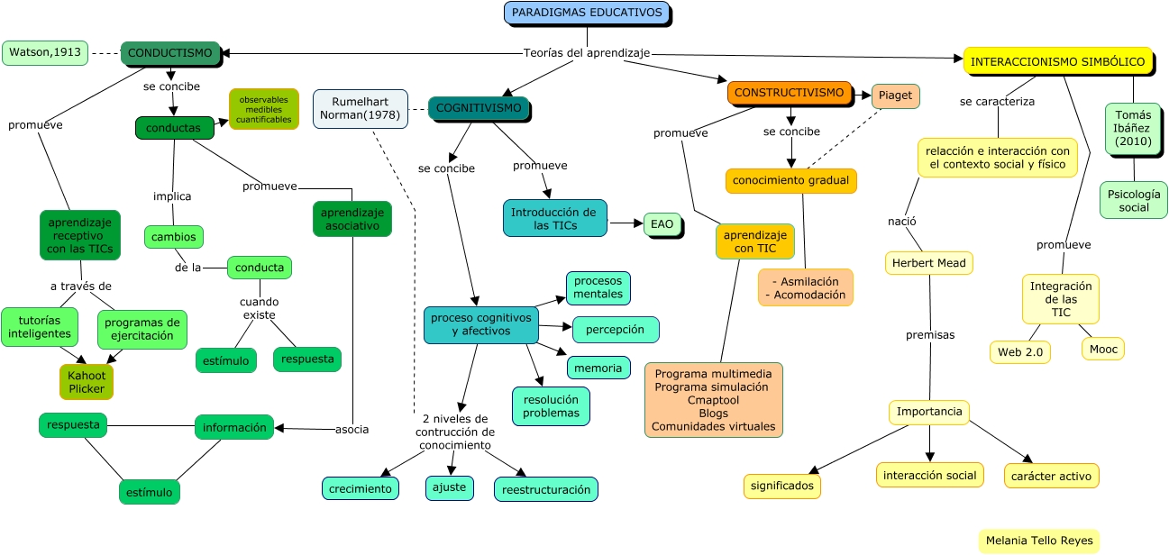 Este Cmap, tiene información relacionada con: paradig, Importancia ???? interacción social, conocimiento gradual ???? - Asmilación - Acomodación, PARADIGMAS EDUCATIVOS Teorías del aprendizaje COGNITIVISMO, cambios de la conducta, Piaget ???? conocimiento gradual, programas de ejercitación a través de aprendizaje receptivo con las TICs, respuesta ???? estímulo, COGNITIVISMO se concibe proceso cognitivos y afectivos, programas de ejercitación ???? Kahoot Plicker, Importancia ???? significados, Integración de las TIC ???? Mooc, conducta cuando existe estímulo, Tomás Ibáñez (2010) ???? Psicología social, CONDUCTISMO promueve aprendizaje receptivo con las TICs, proceso cognitivos y afectivos 2 niveles de contrucción de conocimiento Rumelhart Norman(1978), CONSTRUCTIVISMO se concibe conocimiento gradual, Importancia ???? carácter activo, COGNITIVISMO ???? Rumelhart Norman(1978), proceso cognitivos y afectivos ???? percepción, CONSTRUCTIVISMO promueve aprendizaje con TIC