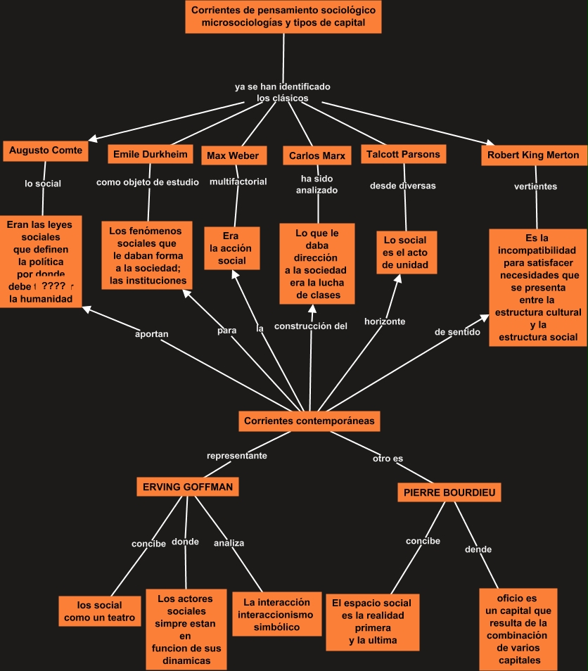 Este Cmap, tiene información relacionada con: CORRIENTES DE PENSAMIENTO SOCIOLOGICO, Corrientes contemporáneas para Los fenómenos sociales que le daban forma a la sociedad; las instituciones, Corrientes de pensamiento sociológico microsociologías y tipos de capital ya se han identificado los clásicos Carlos Marx, Corrientes de pensamiento sociológico microsociologías y tipos de capital ya se han identificado los clásicos Robert King Merton, Corrientes contemporáneas construcción del Lo que le daba dirección a la sociedad era la lucha de clases, Talcott Parsons desde diversas Lo social es el acto de unidad, PIERRE BOURDIEU dende oficio es un capital que resulta de la combinación de varios capitales, Corrientes contemporáneas la Era la acción social, Corrientes contemporáneas aportan Eran las leyes sociales que definen la política por donde debe transitar la humanidad, Robert King Merton vertientes Es la incompatibilidad para satisfacer necesidades que se presenta entre la estructura cultural y la estructura social, Corrientes de pensamiento sociológico microsociologías y tipos de capital ya se han identificado los clásicos Augusto Comte, Corrientes contemporáneas otro es PIERRE BOURDIEU, Corrientes contemporáneas representante ERVING GOFFMAN, ERVING GOFFMAN analiza La interacción interaccionismo simbólico, Augusto Comte lo social Eran las leyes sociales que definen la política por donde debe transitar la humanidad, Emile Durkheim como objeto de estudio Los fenómenos sociales que le daban forma a la sociedad; las instituciones, Corrientes de pensamiento sociológico microsociologías y tipos de capital ya se han identificado los clásicos Talcott Parsons, Max Weber multifactorial Era la acción social, Carlos Marx ha sido analizado Lo que le daba dirección a la sociedad era la lucha de clases, Corrientes de pensamiento sociológico microsociologías y tipos de capital ya se han identificado los clásicos Max Weber, PIERRE BOURDIEU concibe El espacio social es la realidad primera y la ultima