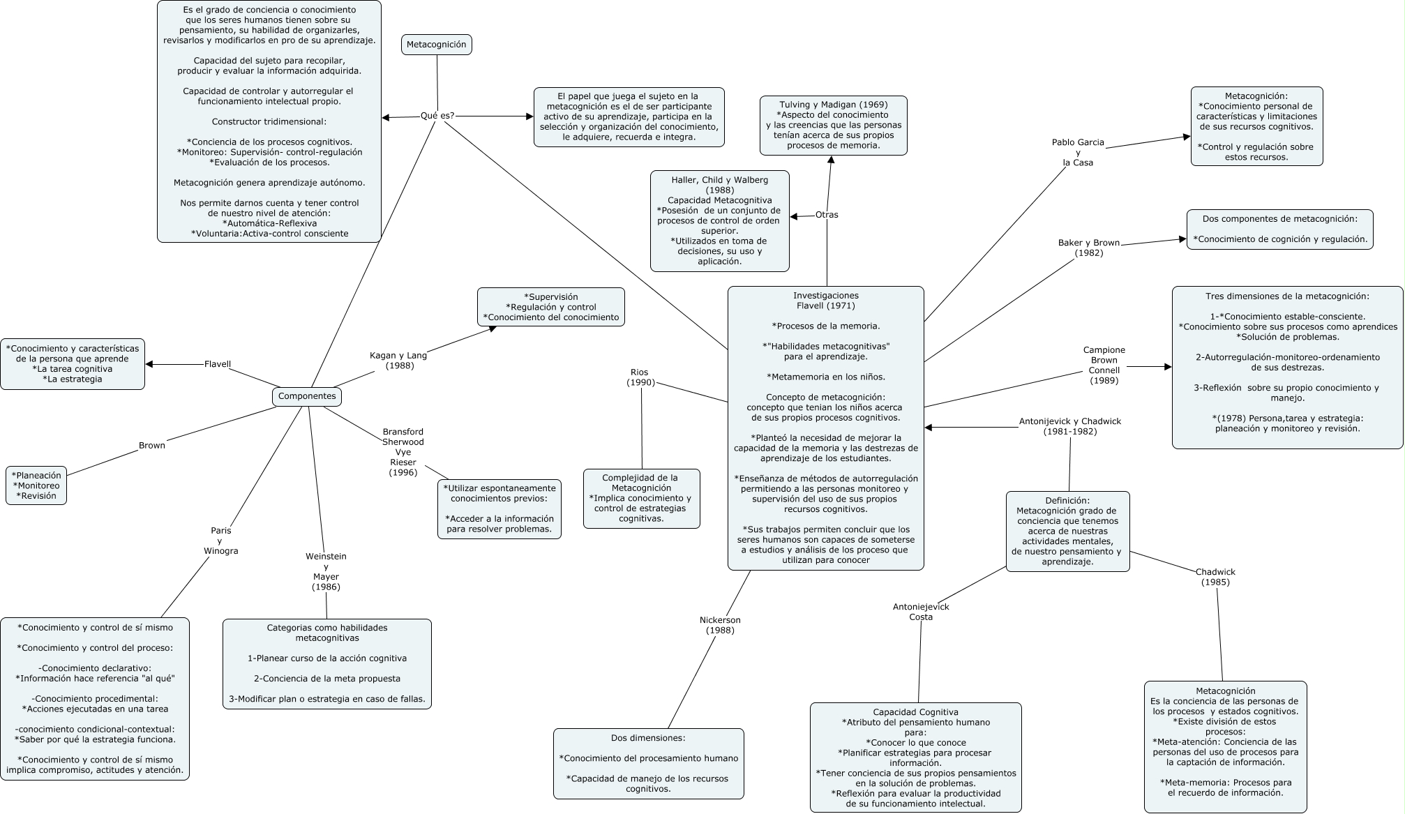 Este Cmap, tiene información relacionada con: METACOGNICION, Componentes Flavell *Conocimiento y características de la persona que aprende *La tarea cognitiva *La estrategia, Investigaciones Flavell (1971) *Procesos de la memoria. *"Habilidades metacognitivas" para el aprendizaje. *Metamemoria en los niños. Concepto de metacognición: concepto que tenian los niños acerca de sus propios procesos cognitivos. *Planteó la necesidad de mejorar la capacidad de la memoria y las destrezas de aprendizaje de los estudiantes. *Enseñanza de métodos de autorregulación permitiendo a las personas monitoreo y supervisión del uso de sus propios recursos cognitivos. *Sus trabajos permiten concluir que los seres humanos son capaces de someterse a estudios y análisis de los proceso que utilizan para conocer Otras Tulving y Madigan (1969) *Aspecto del conocimiento y las creencias que las personas tenían acerca de sus propios procesos de memoria., Definición: Metacognición grado de conciencia que tenemos acerca de nuestras actividades mentales, de nuestro pensamiento y aprendizaje. Antonijevick y Chadwick (1981-1982) Investigaciones Flavell (1971) *Procesos de la memoria. *"Habilidades metacognitivas" para el aprendizaje. *Metamemoria en los niños. Concepto de metacognición: concepto que tenian los niños acerca de sus propios procesos cognitivos. *Planteó la necesidad de mejorar la capacidad de la memoria y las destrezas de aprendizaje de los estudiantes. *Enseñanza de métodos de autorregulación permitiendo a las personas monitoreo y supervisión del uso de sus propios recursos cognitivos. *Sus trabajos permiten concluir que los seres humanos son capaces de someterse a estudios y análisis de los proceso que utilizan para conocer, Componentes Kagan y Lang (1988) *Supervisión *Regulación y control *Conocimiento del conocimiento, Investigaciones Flavell (1971) *Procesos de la memoria. *"Habilidades metacognitivas" para el aprendizaje. *Metamemoria en los niños. Concepto de metacognición: concepto que tenian los niños acerca de sus propios procesos cognitivos. *Planteó la necesidad de mejorar la capacidad de la memoria y las destrezas de aprendizaje de los estudiantes. *Enseñanza de métodos de autorregulación permitiendo a las personas monitoreo y supervisión del uso de sus propios recursos cognitivos. *Sus trabajos permiten concluir que los seres humanos son capaces de someterse a estudios y análisis de los proceso que utilizan para conocer Baker y Brown (1982) Dos componentes de metacognición: *Conocimiento de cognición y regulación., Componentes Brown *Planeación *Monitoreo *Revisión, Metacognición Qué es? Investigaciones Flavell (1971) *Procesos de la memoria. *"Habilidades metacognitivas" para el aprendizaje. *Metamemoria en los niños. Concepto de metacognición: concepto que tenian los niños acerca de sus propios procesos cognitivos. *Planteó la necesidad de mejorar la capacidad de la memoria y las destrezas de aprendizaje de los estudiantes. *Enseñanza de métodos de autorregulación permitiendo a las personas monitoreo y supervisión del uso de sus propios recursos cognitivos. *Sus trabajos permiten concluir que los seres humanos son capaces de someterse a estudios y análisis de los proceso que utilizan para conocer, Definición: Metacognición grado de conciencia que tenemos acerca de nuestras actividades mentales, de nuestro pensamiento y aprendizaje. Antoniejevick Costa Capacidad Cognitiva *Atributo del pensamiento humano para: *Conocer lo que conoce *Planificar estrategias para procesar información. *Tener conciencia de sus propios pensamientos en la solución de problemas. *Reflexión para evaluar la productividad de su funcionamiento intelectual., Metacognición Qué es? Componentes, Investigaciones Flavell (1971) *Procesos de la memoria. *"Habilidades metacognitivas" para el aprendizaje. *Metamemoria en los niños. Concepto de metacognición: concepto que tenian los niños acerca de sus propios procesos cognitivos. *Planteó la necesidad de mejorar la capacidad de la memoria y las destrezas de aprendizaje de los estudiantes. *Enseñanza de métodos de autorregulación permitiendo a las personas monitoreo y supervisión del uso de sus propios recursos cognitivos. *Sus trabajos permiten concluir que los seres humanos son capaces de someterse a estudios y análisis de los proceso que utilizan para conocer Campione Brown Connell (1989) Tres dimensiones de la metacognición: 1-*Conocimiento estable-consciente. *Conocimiento sobre sus procesos como aprendices *Solución de problemas. 2-Autorregulación-monitoreo-ordenamiento de sus destrezas. 3-Reflexión sobre su propio conocimiento y manejo. *(1978) Persona,tarea y estrategia: planeación y monitoreo y revisión., Investigaciones Flavell (1971) *Procesos de la memoria. *"Habilidades metacognitivas" para el aprendizaje. *Metamemoria en los niños. Concepto de metacognición: concepto que tenian los niños acerca de sus propios procesos cognitivos. *Planteó la necesidad de mejorar la capacidad de la memoria y las destrezas de aprendizaje de los estudiantes. *Enseñanza de métodos de autorregulación permitiendo a las personas monitoreo y supervisión del uso de sus propios recursos cognitivos. *Sus trabajos permiten concluir que los seres humanos son capaces de someterse a estudios y análisis de los proceso que utilizan para conocer Pablo Garcia y la Casa Metacognición: *Conocimiento personal de características y limitaciones de sus recursos cognitivos. *Control y regulación sobre estos recursos., Componentes Paris y Winogra *Conocimiento y control de sí mismo *Conocimiento y control del proceso: -Conocimiento declarativo: *Información hace referencia "al qué" -Conocimiento procedimental: *Acciones ejecutadas en una tarea -conocimiento condicional-contextual: *Saber por qué la estrategia funciona. *Conocimiento y control de sí mismo implica compromiso, actitudes y atención., Componentes Weinstein y