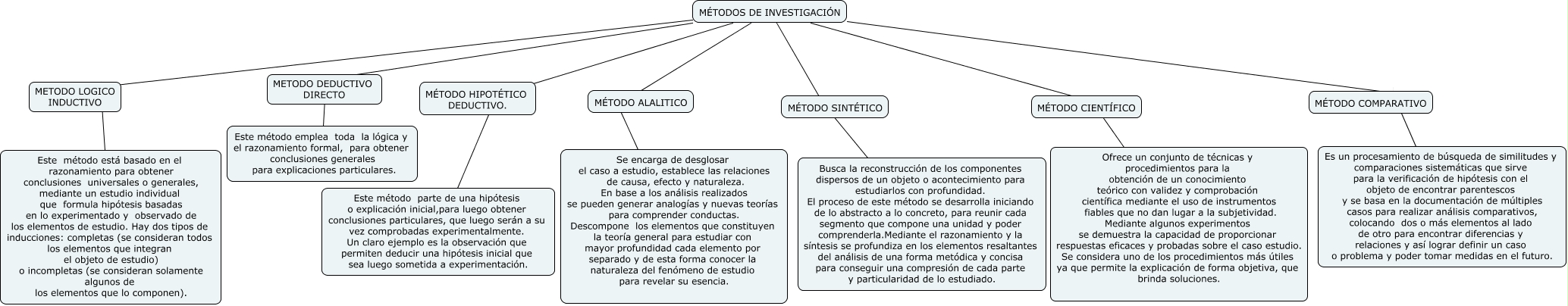 Este Cmap, tiene información relacionada con: Metodos Cientificos, MÉTODOS DE INVESTIGACIÓN Este método está basado en el razonamiento para obtener conclusiones universales o generales, mediante un estudio individual que formula hipótesis basadas en lo experimentado y observado de los elementos de estudio. Hay dos tipos de inducciones: completas (se consideran todos los elementos que integran el objeto de estudio) o incompletas (se consideran solamente algunos de los elementos que lo componen)., MÉTODOS DE INVESTIGACIÓN Este método parte de una hipótesis o explicación inicial,para luego obtener conclusiones particulares, que luego serán a su vez comprobadas experimentalmente. Un claro ejemplo es la observación que permiten deducir una hipótesis inicial que sea luego sometida a experimentación., MÉTODOS DE INVESTIGACIÓN Es un procesamiento de búsqueda de similitudes y comparaciones sistemáticas que sirve para la verificación de hipótesis con el objeto de encontrar parentescos y se basa en la documentación de múltiples casos para realizar análisis comparativos, colocando dos o más elementos al lado de otro para encontrar diferencias y relaciones y así lograr definir un caso o problema y poder tomar medidas en el futuro., MÉTODOS DE INVESTIGACIÓN Busca la reconstrucción de los componentes dispersos de un objeto o acontecimiento para estudiarlos con profundidad. El proceso de este método se desarrolla iniciando de lo abstracto a lo concreto, para reunir cada segmento que compone una unidad y poder comprenderla.Mediante el razonamiento y la síntesis se profundiza en los elementos resaltantes del análisis de una forma metódica y concisa para conseguir una compresión de cada parte y particularidad de lo estudiado., MÉTODOS DE INVESTIGACIÓN Se encarga de desglosar el caso a estudio, establece las relaciones de causa, efecto y naturaleza. En base a los análisis realizados se pueden generar analogías y nuevas teorías para comprender conductas. Descompone los elementos que constituyen la teoría general para estudiar con mayor profundidad cada elemento por separado y de esta forma conocer la naturaleza del fenómeno de estudio para revelar su esencia., MÉTODOS DE INVESTIGACIÓN Este método emplea toda la lógica y el razonamiento formal, para obtener conclusiones generales para explicaciones particulares., MÉTODOS DE INVESTIGACIÓN Ofrece un conjunto de técnicas y procedimientos para la obtención de un conocimiento teórico con validez y comprobación científica mediante el uso de instrumentos fiables que no dan lugar a la subjetividad. Mediante algunos experimentos se demuestra la capacidad de proporcionar respuestas eficaces y probadas sobre el caso estudio. Se considera uno de los procedimientos más útiles ya que permite la explicación de forma objetiva, que brinda soluciones.