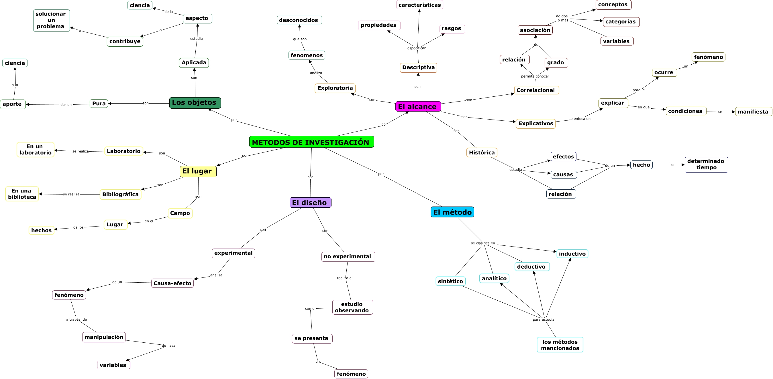 Este Cmap, tiene información relacionada con: Metodos de investigación, El diseño son no experimental, Pura dar un aporte, Los objetos son Pura, El alcance son Correlacional, El lugar son Campo, Descriptiva especifican características, efectos de un hecho, Los objetos son Aplicada, ocurre un fenómeno, asociación de dos o más categorias, se presenta un fenómeno, Aplicada estudia aspecto, aspecto de la ciencia, sintético para estudiar deductivo, El diseño son experimental, METODOS DE INVESTIGACIÓN por El diseño, fenomenos que son desconocidos, El método se clasifica en inductivo, El alcance son Explicativos, explicar en que condiciones