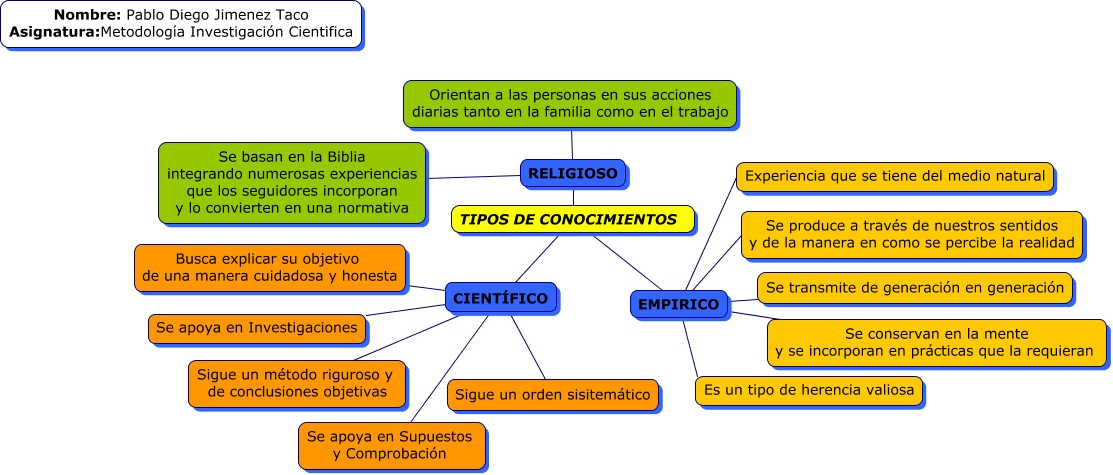 Este Cmap, tiene información relacionada con: Tipos de conocimientos, CIENTÍFICO Se apoya en Supuestos y Comprobación, EMPIRICO ???? Se conservan en la mente y se incorporan en prácticas que la requieran, TIPOS DE CONOCIMIENTOS CIENTÍFICO, CIENTÍFICO Se apoya en Investigaciones, EMPIRICO Se produce a través de nuestros sentidos y de la manera en como se percibe la realidad, EMPIRICO Se transmite de generación en generación, RELIGIOSO Se basan en la Biblia integrando numerosas experiencias que los seguidores incorporan y lo convierten en una normativa, CIENTÍFICO Busca explicar su objetivo de una manera cuidadosa y honesta, TIPOS DE CONOCIMIENTOS EMPIRICO, EMPIRICO Es un tipo de herencia valiosa, CIENTÍFICO Sigue un orden sisitemático, TIPOS DE CONOCIMIENTOS RELIGIOSO, RELIGIOSO Orientan a las personas en sus acciones diarias tanto en la familia como en el trabajo, CIENTÍFICO Sigue un método riguroso y de conclusiones objetivas, EMPIRICO Experiencia que se tiene del medio natural