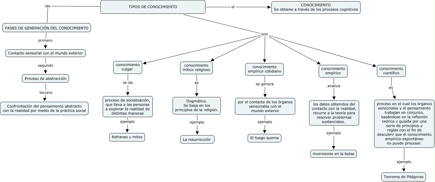 Este Cmap, tiene información relacionada con: tipos de conocimiento, proceso de socialización, que lleva a las personas a explorar la realidad de distintas maneras ejemplo Refranes y mitos, conocimiento vulgar se da proceso de socialización, que lleva a las personas a explorar la realidad de distintas maneras, por el contacto de los órganos sensoriales con el mundo exterior ejemplo El fuego quema, conocimiento mítico religioso es Dogmático. Se basa en los principios de la religión., conocimiento empírico cotidiano se genera por el contacto de los órganos sensoriales con el mundo exterior, TIPOS DE CONOCIMIENTO son conocimiento empírico cotidiano, Contacto sensorial con el mundo exterior segundo Proceso de abstracción, TIPOS DE CONOCIMIENTO el CONOCIMIENTO Se obtiene a través de los procesos cognitivos, Proceso de abstracción tercero Confrontación del pensamiento abstracto con la realidad por medio de la práctica social, TIPOS DE CONOCIMIENTO las FASES DE GENERACIÓN DEL CONOCIMIENTO, conocimiento empírico analiza los datos obtenidos del contacto con la realidad, recurre a la teoría para resolver problemas sustanciales., FASES DE GENERACIÓN DEL CONOCIMIENTO primero Contacto sensorial con el mundo exterior, TIPOS DE CONOCIMIENTO son conocimiento mítico religioso, TIPOS DE CONOCIMIENTO son conocimiento empírico, TIPOS DE CONOCIMIENTO son conocimiento vulgar, Dogmático. Se basa en los principios de la religión. ejemplo La resurrección, los datos obtenidos del contacto con la realidad, recurre a la teoría para resolver problemas sustanciales. ejemplo inversiones en la bolsa, TIPOS DE CONOCIMIENTO son conocimiento científico, proceso en el cual los órganos sensoriales y el pensamiento trabajan en conjunto, basándose en la reflexión teórica y guiada por una serie de principios y reglas con el fin de descubrir que el conocimiento empírico-espontáneo no puede procesar. ejemplo Teorema de Pitágoras, conocimiento científico es proceso en el cual los órganos sensoriales y el pensamiento trabajan en conjunto, basándose en la reflexión teórica y guiada por una serie de principios y reglas con el fin de descubrir que el conocimiento empírico-espontáneo no puede procesar.