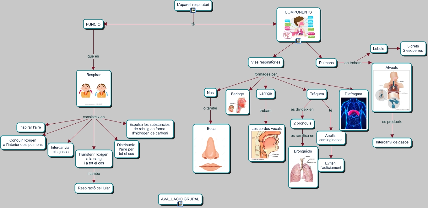 Este Cmap, tiene información relacionada con: Aparell respiratori, Pulmons on trobam Lòbuls, Respirar consisteix en Distribueix l'aire per tot el cos, COMPONENTS per exemple Vies respiratòries, Lòbuls ???? 3 drets 2 esquerres, Respirar consisteix en Expulsa les substàncies de rebuig en forma d'hidrogen de carboni, Vies respiratòries formades per Tràquea, Anells cartilaginosos ???? Eviten l'asfixiament, FUNCIÓ que és Respirar, Respirar consisteix en Inspirar l'aire, Laringe trobam Les cordes vocals, Tràquea té Anells cartilaginosos, Respirar consisteix en Transferir l'oxigen a la sang i a tot el cos, COMPONENTS per exemple Pulmons, Pulmons on trobam Alveols, L'aparell respiratori té COMPONENTS, Transferir l'oxigen a la sang i a tot el cos i també Respiració cel·lular, Alveols es produeix Intercanvi de gasos, Respirar consisteix en Intercanvia els gasos, 2 bronquis es ramifica en Bronquíols, Nas o també Boca