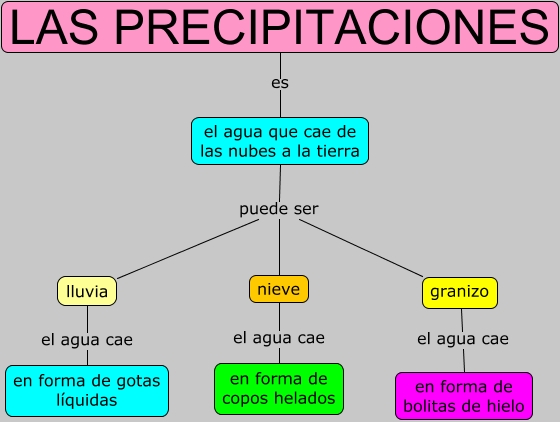 Este Cmap, tiene información relacionada con: Las precipitaciones, nieve el agua cae en forma de copos helados, lluvia el agua cae en forma de gotas líquidas, granizo el agua cae en forma de bolitas de hielo, el agua que cae de las nubes a la tierra puede ser granizo, el agua que cae de las nubes a la tierra puede ser nieve, LAS PRECIPITACIONES es el agua que cae de las nubes a la tierra, el agua que cae de las nubes a la tierra puede ser lluvia