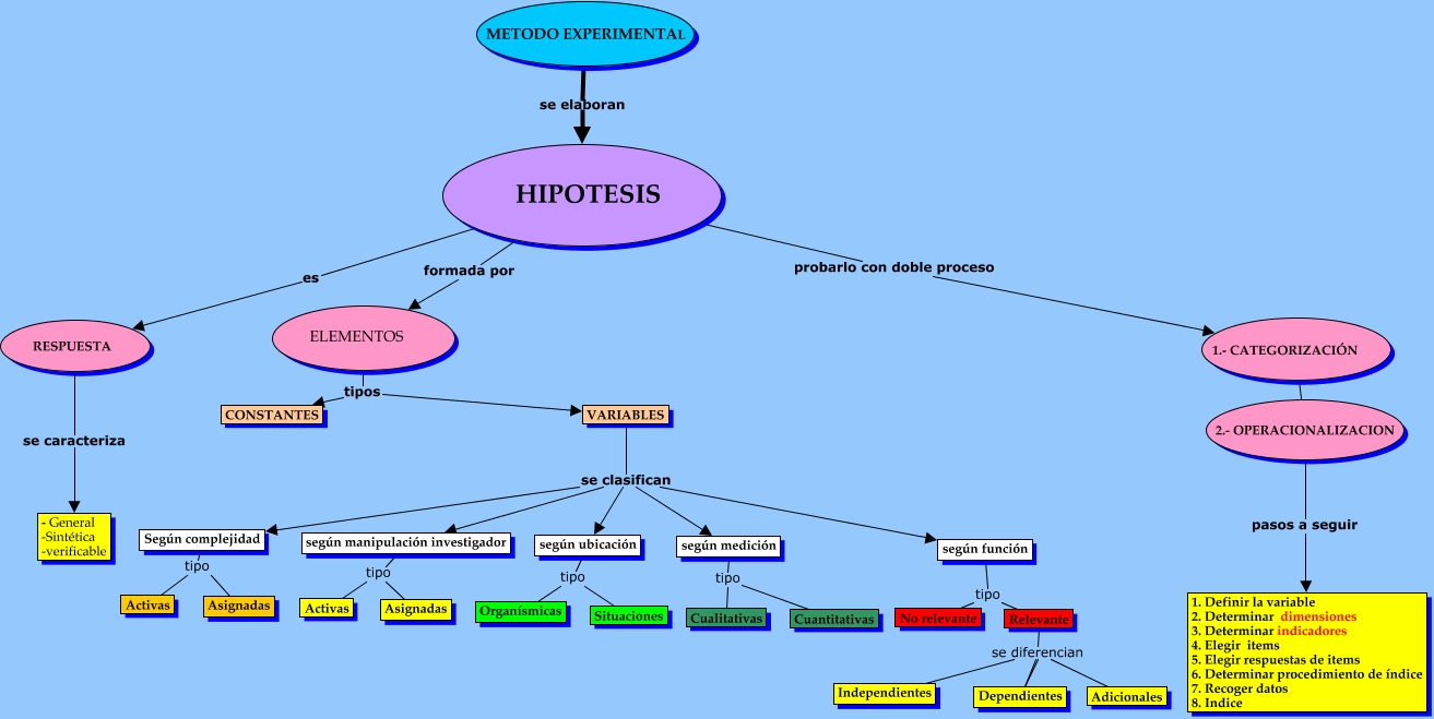 Este Cmap, tiene información relacionada con: Tema 5, RESPUESTA se caracteriza - General -Sintética -verificable, METODO EXPERIMENTAL se elaboran HIPOTESIS, VARIABLES se clasifican según función, según medición tipo Cualitativas, según medición tipo Cuantitativas, ELEMENTOS tipos CONSTANTES, Relevante se diferencian Adicionales, según manipulación investigador tipo Asignadas, VARIABLES se clasifican según ubicación, Asignadas tipo Activas, Relevante se diferencian Dependientes, según ubicación tipo Organísmicas, Dependientes se diferencian Independientes, según función tipo No relevante, Según complejidad tipo Activas, VARIABLES se clasifican según manipulación investigador, según ubicación tipo Situaciones, 1.- CATEGORIZACIÓN ???? 2.- OPERACIONALIZACION, VARIABLES se clasifican Según complejidad, Relevante se diferencian Independientes