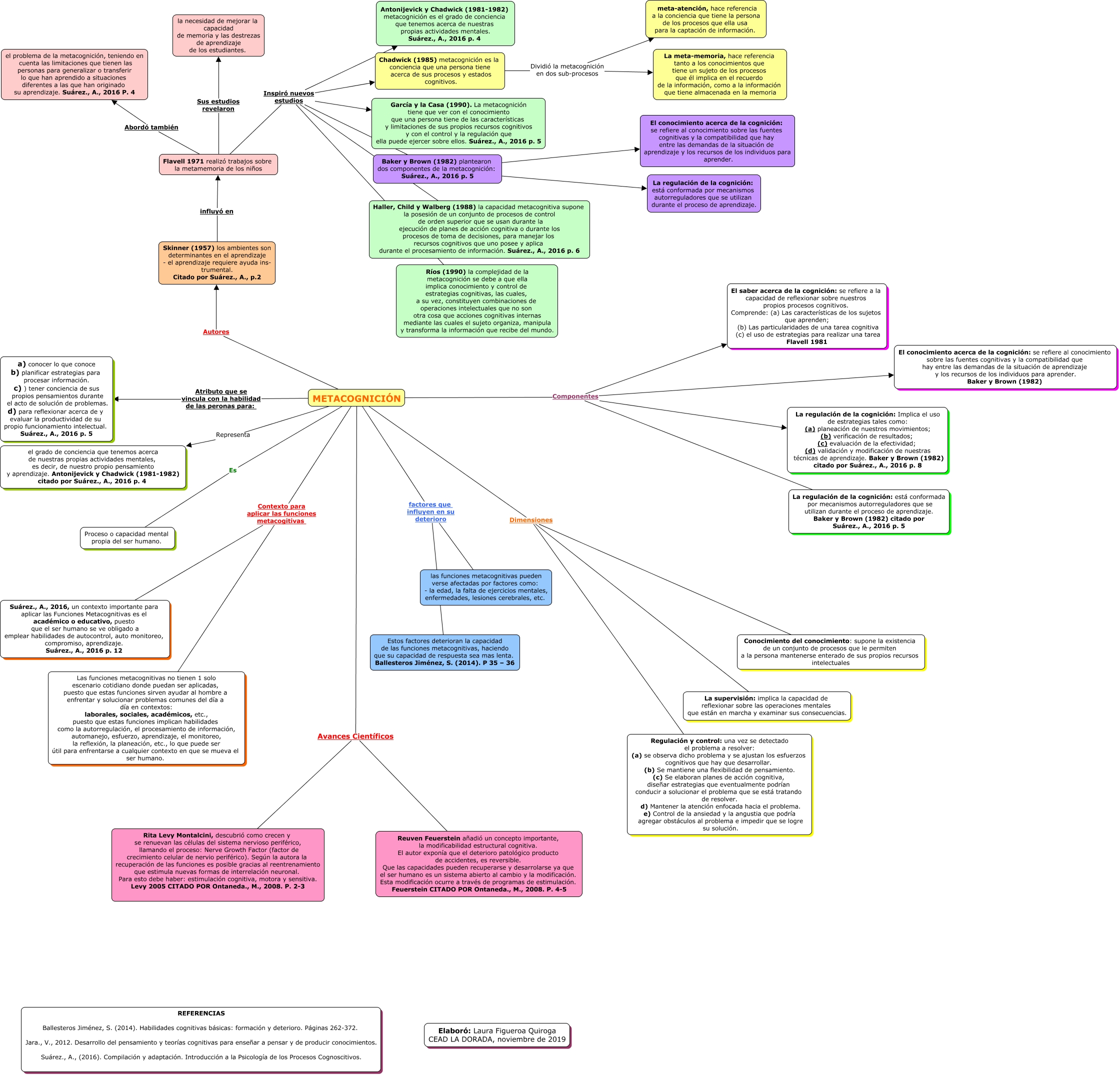 Este Cmap, tiene información relacionada con: Metacognición, Flavell 1971 realizó trabajos sobre la metamemoria de los niños Abordó también el problema de la metacognición, teniendo en cuenta las limitaciones que tienen las personas para generalizar o transferir lo que han aprendido a situaciones diferentes a las que han originado su aprendizaje. Suárez., A., 2016 P. 4, METACOGNICIÓN Autores Skinner (1957) los ambientes son determinantes en el aprendizaje - el aprendizaje requiere ayuda ins- trumental. Citado por Suárez., A., p.2, Flavell 1971 realizó trabajos sobre la metamemoria de los niños Sus estudios revelaron la necesidad de mejorar la capacidad de memoria y las destrezas de aprendizaje de los estudiantes., METACOGNICIÓN Avances Científicos Reuven Feuerstein añadió un concepto importante, la modificabilidad estructural cognitiva. El autor exponía que el deterioro patológico producto de accidentes, es reversible. Que las capacidades pueden recuperarse y desarrolarse ya que el ser humano es un sistema abierto al cambio y la modificación. Esta modificación ocurre a través de programas de estimulación. Feuerstein CITADO POR Ontaneda., M., 2008. P. 4-5, METACOGNICIÓN factores que influyen en su deterioro Estos factores deterioran la capacidad de las funciones metacognitivas, haciendo que su capacidad de respuesta sea mas lenta. Ballesteros Jiménez, S. (2014). P 35 – 36, METACOGNICIÓN Contexto para aplicar las funciones metacogitivas Las funciones metacognitivas no tienen 1 solo escenario cotidiano donde puedan ser aplicadas, puesto que estas funciones sirven ayudar al hombre a enfrentar y solucionar problemas comunes del día a día en contextos: laborales, sociales, académicos, etc., puesto que estas funciones implican habilidades como la autorregulación, el procesamiento de información, automanejo, esfuerzo, aprendizaje, el monitoreo, la reflexión, la planeación, etc., lo que puede ser útil para enfrentarse a cualquier contexto en que se mueva el ser humano., Flavell 1971 realizó trabajos sobre la metamemoria de los niños Inspiró nuevos estudios García y la Casa (1990). La metacognición tiene que ver con el conocimiento que una persona tiene de las características y limitaciones de sus propios recursos cognitivos y con el control y la regulación que ella puede ejercer sobre ellos. Suárez., A., 2016 p. 5, METACOGNICIÓN Dimensiones Conocimiento del conocimiento: supone la existencia de un conjunto de procesos que le permiten a la persona mantenerse enterado de sus propios recursos intelectuales, METACOGNICIÓN factores que influyen en su deterioro las funciones metacognitivas pueden verse afectadas por factores como: - la edad, la falta de ejercicios mentales, enfermedades, lesiones cerebrales, etc., METACOGNICIÓN Componentes El conocimiento acerca de la cognición: se refiere al conocimiento sobre las fuentes cognitivas y la compatibilidad que hay entre las demandas de la situación de aprendizaje y los recursos de los individuos para aprender. Baker y Brown (1982), Baker y Brown (1982) plantearon dos componentes de la metacognición: Suárez., A., 2016 p. 5 ???? El conocimiento acerca de la cognición: se refiere al conocimiento sobre las fuentes cognitivas y la compatibilidad que hay entre las demandas de la situación de aprendizaje y los recursos de los individuos para aprender., METACOGNICIÓN Avances Científicos Rita Levy Montalcini, descubrió como crecen y se renuevan las células del sistema nervioso periférico, llamando el proceso: Nerve Growth Factor (factor de crecimiento celular de nervio periférico). Según la autora la recuperación de las funciones es posible gracias al reentrenamiento que estimula nuevas formas de interrelación neuronal. Para esto debe haber: estimulación cognitiva, motora y sensitiva. Levy 2005 CITADO POR Ontaneda., M., 2008. P. 2-3, Flavell 1971 realizó trabajos sobre la metamemoria de los niños Inspiró nuevos estudios Ríos (1990) la complejidad de la metacognición se debe a que ella implica conocimiento y control de estrategias cognitivas, las cuales, a su vez, constituyen combinaciones de operaciones intelectuales que no son otra cosa que acciones cognitivas internas mediante las cuales el sujeto organiza, manipula y transforma la información que recibe del mundo., Skinner (1957) los ambientes son determinantes en el aprendizaje - el aprendizaje requiere ayuda ins- trumental. Citado por Suárez., A., p.2 influyó en Flavell 1971 realizó trabajos sobre la metamemoria de los niños, Flavell 1971 realizó trabajos sobre la metamemoria de los niños Inspiró nuevos estudios Baker y Brown (1982) plantearon dos componentes de la metacognición: Suárez., A., 2016 p. 5, METACOGNICIÓN Dimensiones La supervisión: implica la capacidad de reflexionar sobre las operaciones mentales que están en marcha y examinar sus consecuencias., METACOGNICIÓN Representa el grado de conciencia que tenemos acerca de nuestras propias actividades mentales, es decir, de nuestro propio pensamiento y aprendizaje. Antonijevick y Chadwick (1981-1982) citado por Suárez., A., 2016 p. 4, METACOGNICIÓN Contexto para aplicar las funciones metacogitivas Suárez., A., 2016, un contexto importante para aplicar las Funciones Metacognitivas es el académico o educativo, puesto que el ser humano se ve obligado a emplear habilidades de autocontrol, auto monitoreo, compromiso, aprendizaje. Suárez., A., 2016 p. 12, METACOGNICIÓN Dimensiones Regulación y control: una vez se detectado el problema a resolver: (a) se observa dicho problema y se ajustan los esfuerzos cognitivos que hay que desarrollar. (b) Se mantiene una flexibilidad de pensamiento. (c) Se elaboran planes de acción cognitiva, diseñar estrategias que eventualmente podrían conducir a solucionar el problema que se está tratando de resolver. d) Mantener la atención enfocada hacia el problema. e) Control de la ansiedad y la angustia que podría agregar obstáculos al pr