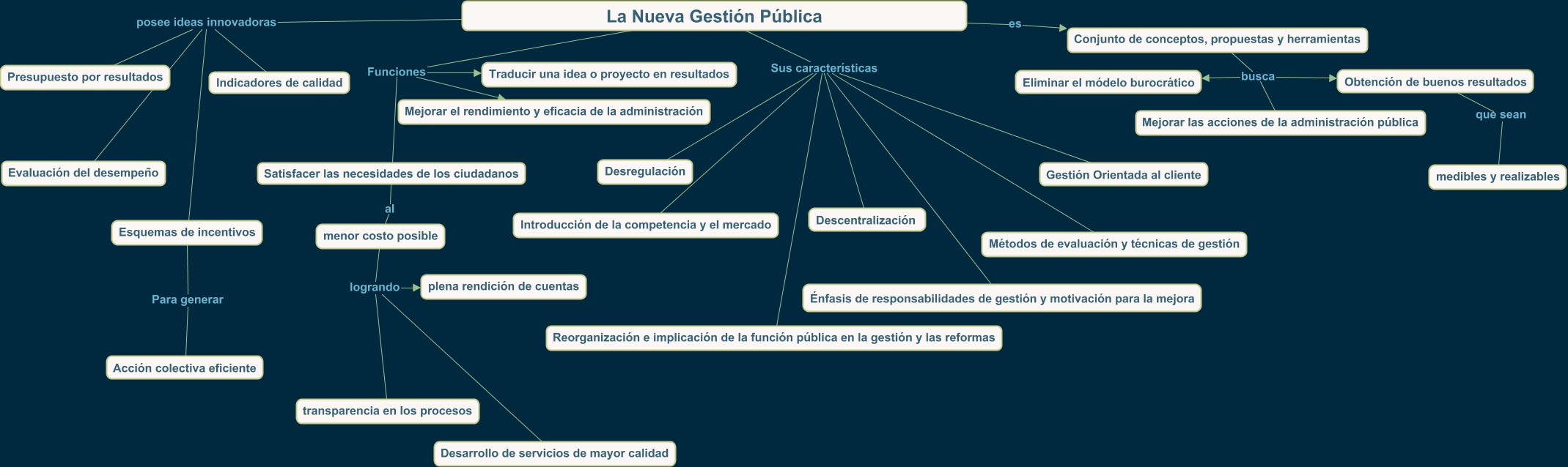 Este Cmap, tiene información relacionada con: La Nueva Gestión Pública, Conjunto de conceptos, propuestas y herramientas busca Eliminar el módelo burocrático, La Nueva Gestión Pública Funciones Satisfacer las necesidades de los ciudadanos, menor costo posible logrando transparencia en los procesos, La Nueva Gestión Pública posee ideas innovadoras Indicadores de calidad, La Nueva Gestión Pública Sus características Desregulación, Satisfacer las necesidades de los ciudadanos al menor costo posible, La Nueva Gestión Pública Sus características Métodos de evaluación y técnicas de gestión, menor costo posible logrando plena rendición de cuentas, La Nueva Gestión Pública Sus características Gestión Orientada al cliente, La Nueva Gestión Pública Funciones Traducir una idea o proyecto en resultados, La Nueva Gestión Pública Sus características Introducción de la competencia y el mercado, Conjunto de conceptos, propuestas y herramientas busca Obtención de buenos resultados, Conjunto de conceptos, propuestas y herramientas busca Mejorar las acciones de la administración pública, La Nueva Gestión Pública Funciones Mejorar el rendimiento y eficacia de la administración, La Nueva Gestión Pública posee ideas innovadoras Presupuesto por resultados, La Nueva Gestión Pública Sus características Reorganización e implicación de la función pública en la gestión y las reformas, La Nueva Gestión Pública posee ideas innovadoras Evaluación del desempeño, La Nueva Gestión Pública es Conjunto de conceptos, propuestas y herramientas, La Nueva Gestión Pública Sus características Descentralización, La Nueva Gestión Pública posee ideas innovadoras Esquemas de incentivos