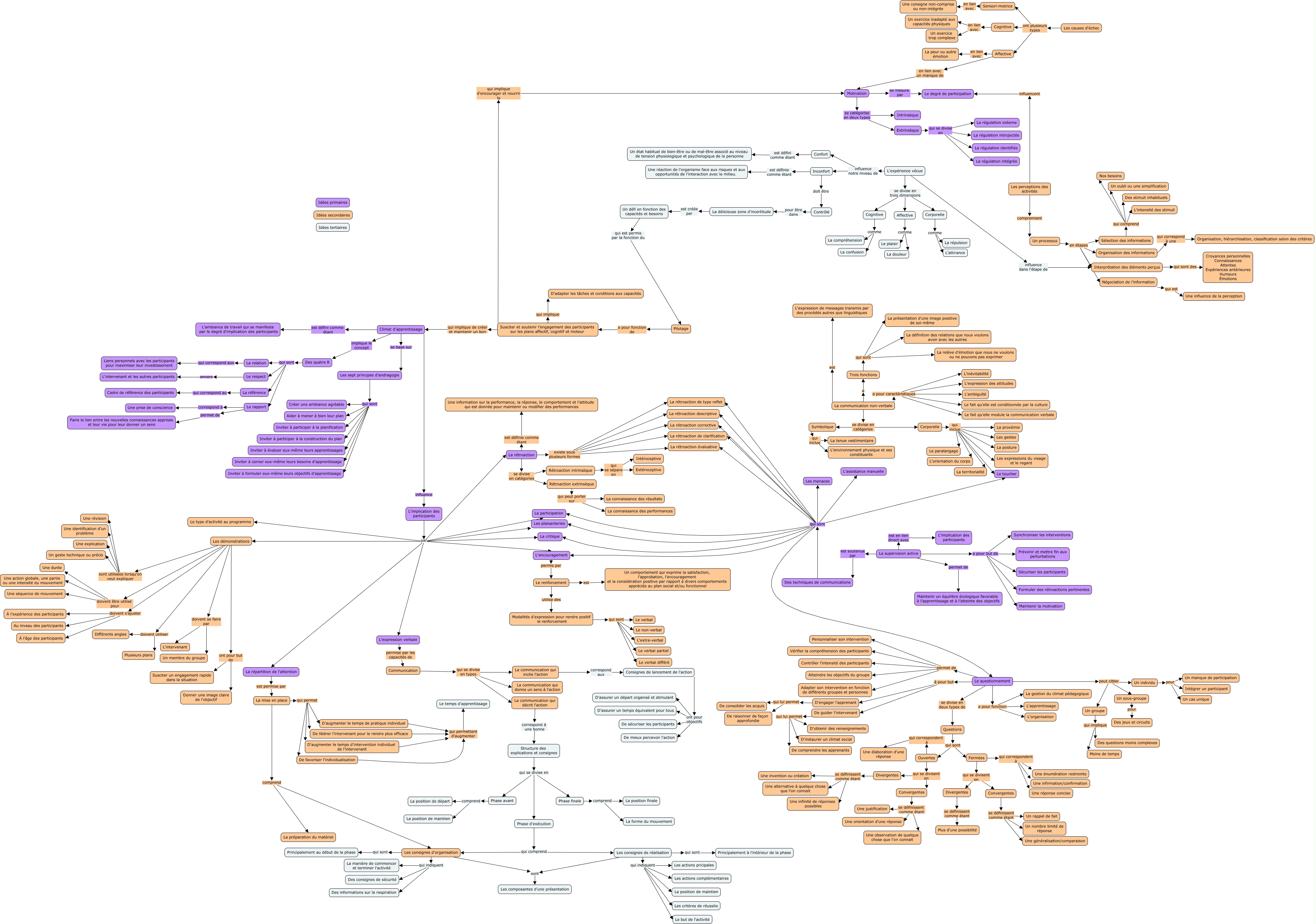 Cette carte de concepts créée avec IHMC CmapTools traite de: Carte Conceptuelle Intervention, Divergentes se définissent comme étant Plus d'une possibilité, L'implication des participants par La participation, Structure des explications et consignes qui se divise en Phase finale, Négociation de l’information qui est Une influence de la perception, Le questionnement a pour fonction L'apprentissage, Des techniques de communications qui sont L'encouragement, L'expérience vécue se divise en trois dimensions Corporelle, La délicieuse zone d'incertitude est créée par Un défi en fonction des capacités et besoins, Les sept principes d'andragogie qui sont Aider à mener à bien leur plan, L'implication des participants par L'expression verbale, Contrôlé pour être dans La délicieuse zone d'incertitude, L'implication des participants par La critique, Des techniques de communications qui sont La participation, Sélection des informations qui comprend L'intensité des stimuli, Rétroaction intrinsèque qui se sépare en Intéroceptive, Rétroaction extrinsèque qui peut porter sur La connaissance des performances, De favoriser l'individualisation qui permettent d'augmenter Le temps d'apprentissage, Les consignes d'organisation qui indiquent Des consignes de sécurité, Confort est défini comme étant Un état habituel de bien-être ou de mal-être associé au niveau de tension physiologique et psychologique de la personne, Des quatre R qui sont Le rapport